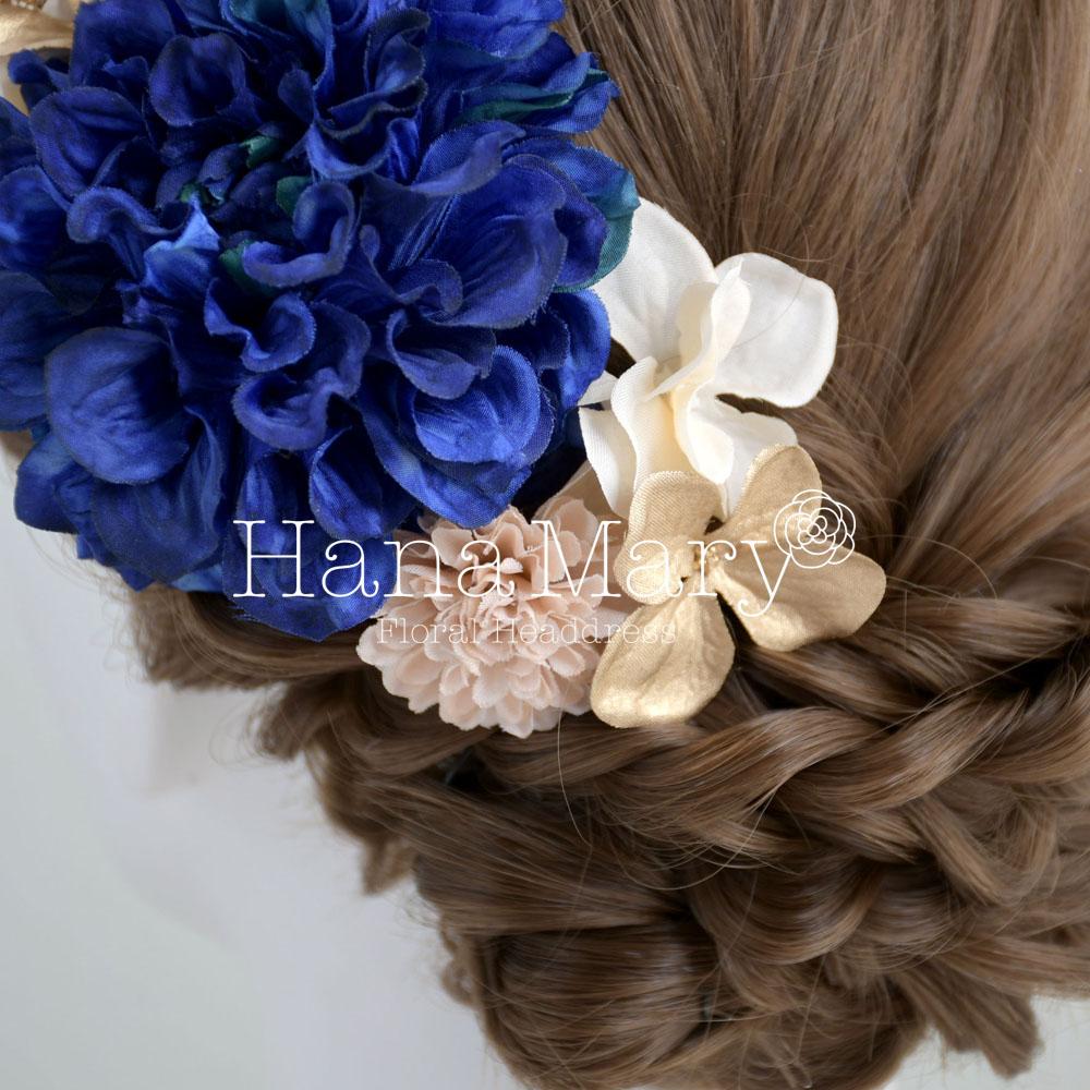 ダリアにゴールドを添えて【紺碧青】成人式 卒業式 結婚式 髪飾り 袴 振袖 着物