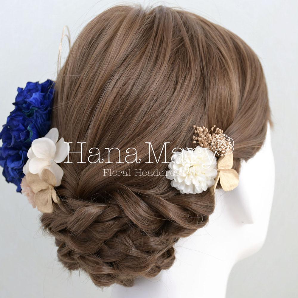複雑な色味の青が様々に混ざり合うリアルな花弁のブルーダリアに、ゴールドパーツを取り入れたクラシカルモダンな髪飾り。