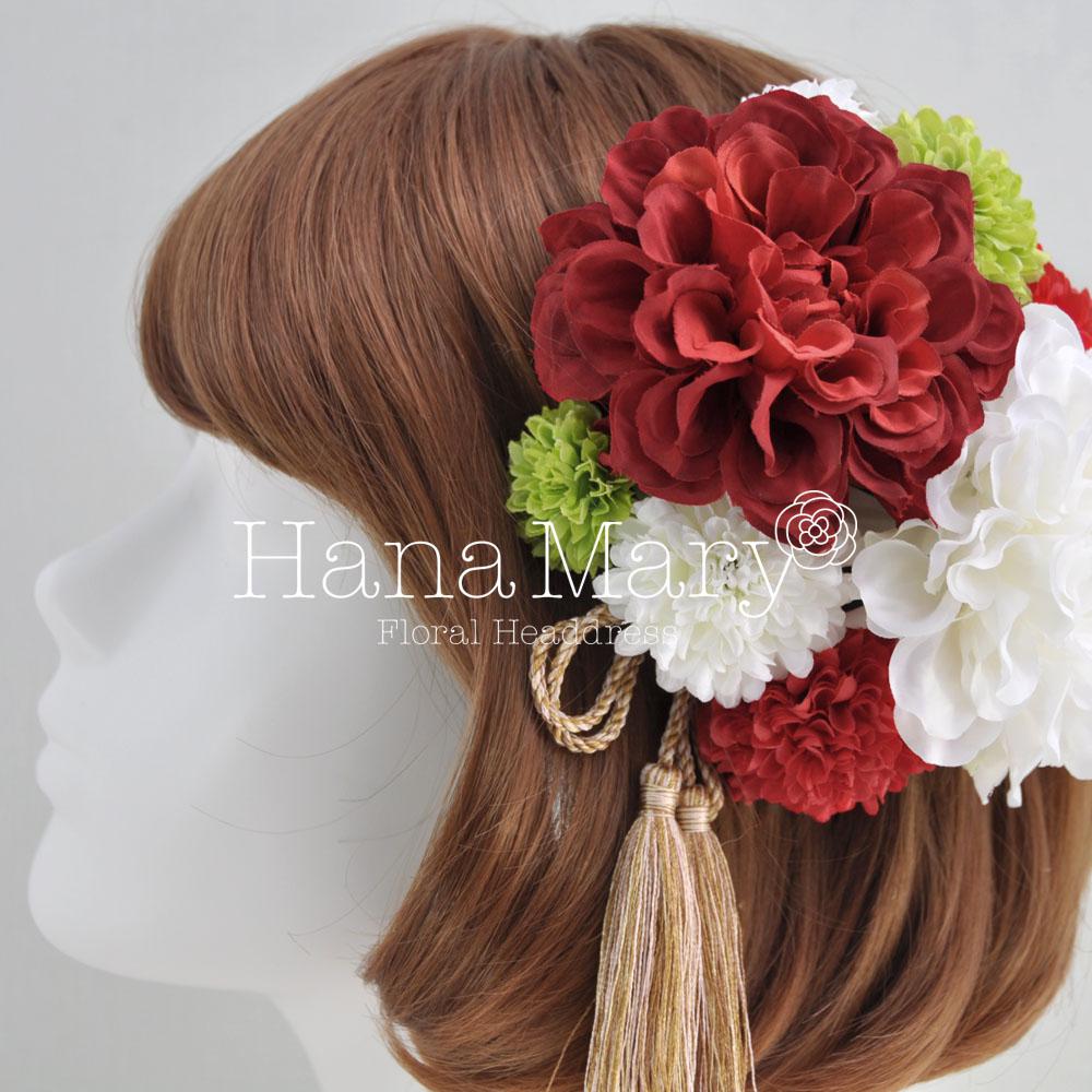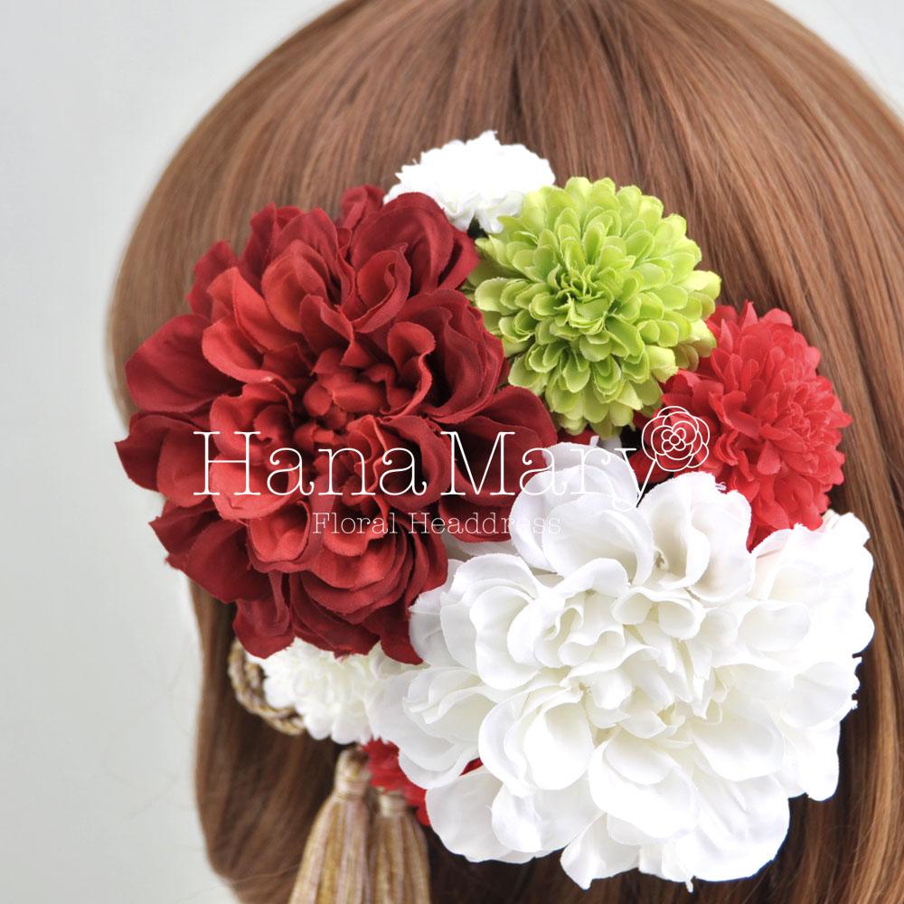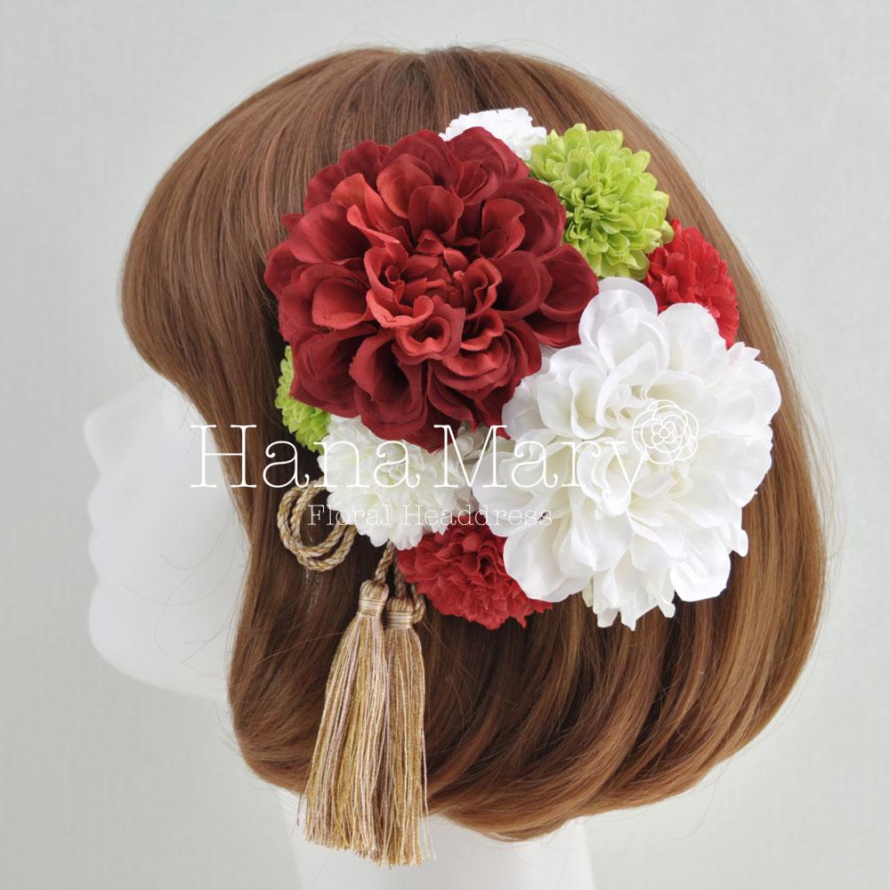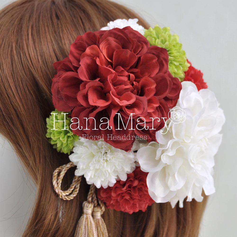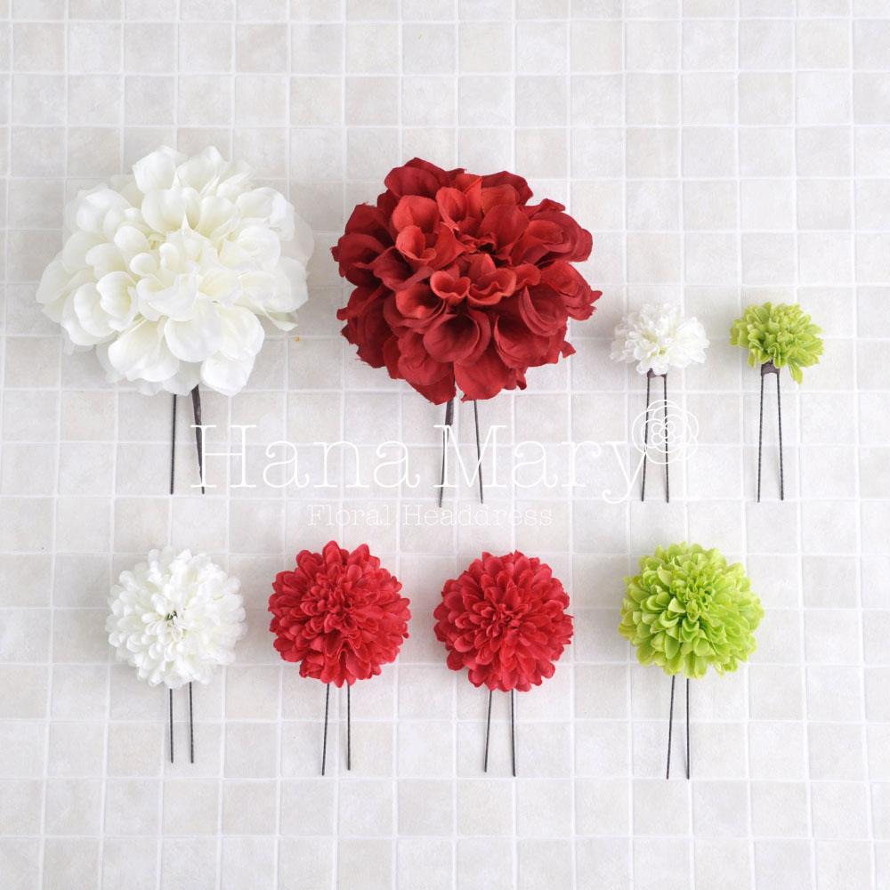 人気のお花、ダリアを2輪組み合わせ、SS&Sサイズのピンポンマムを6輪つかったとても華やかな髪飾りです。
