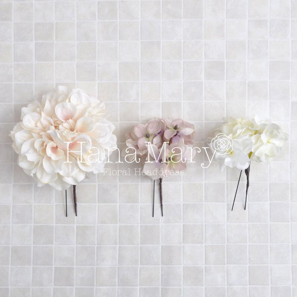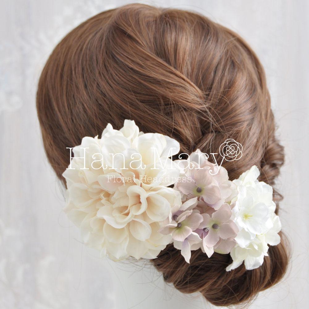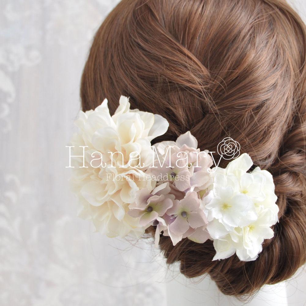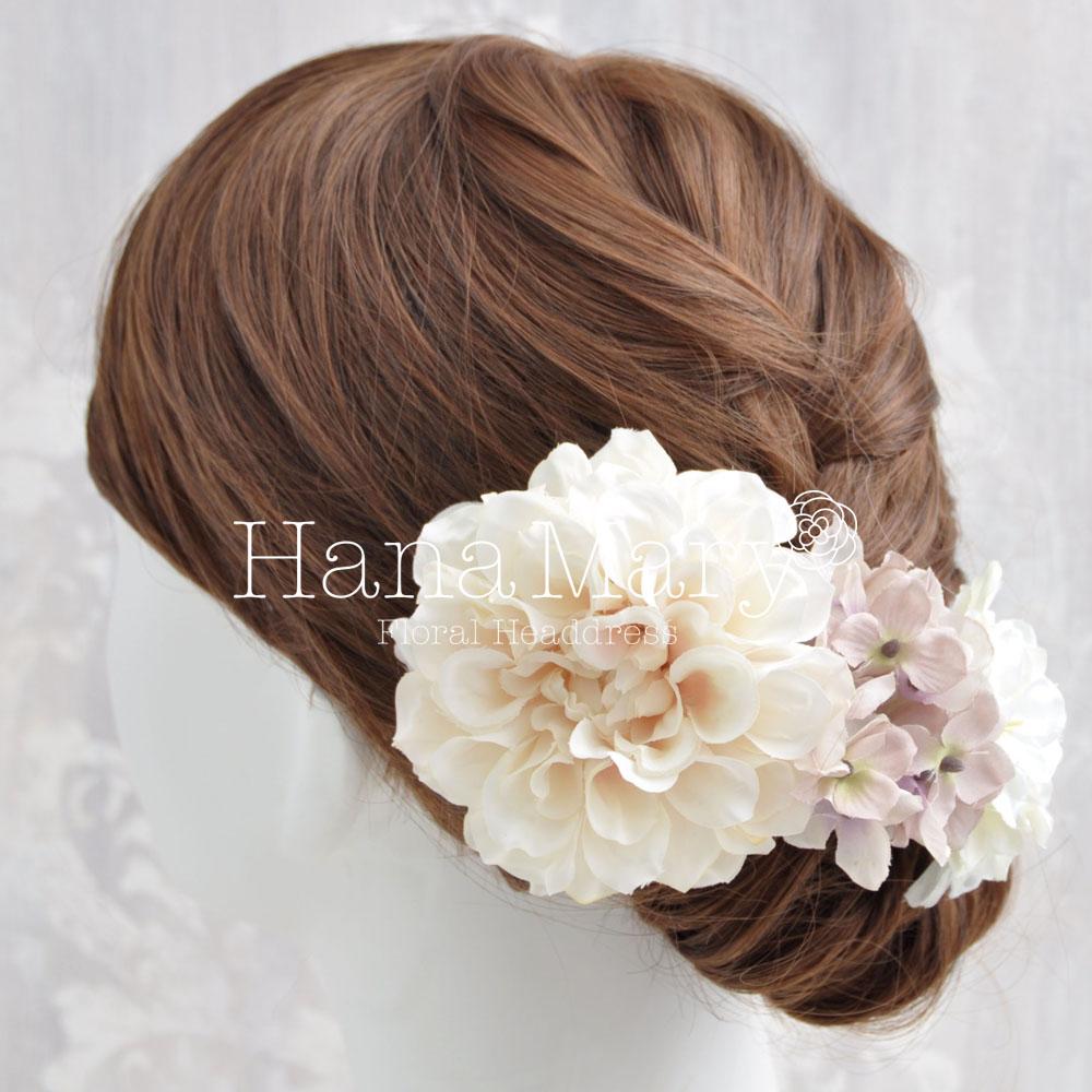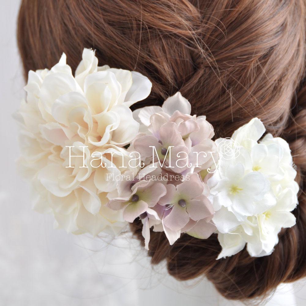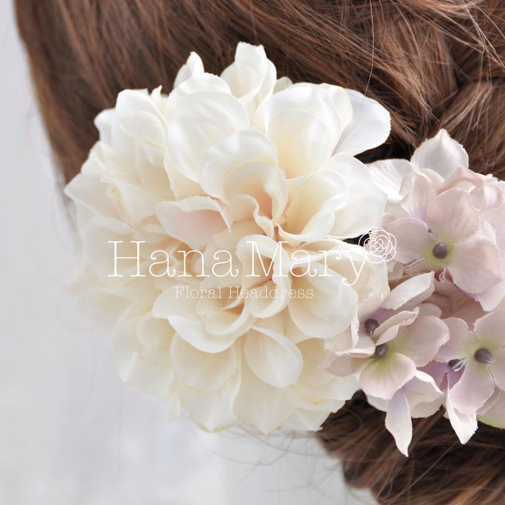 ダリアとあじさいのお花を組み合わせた、柔らかな色合いのシンプルなヘッドドレスです。