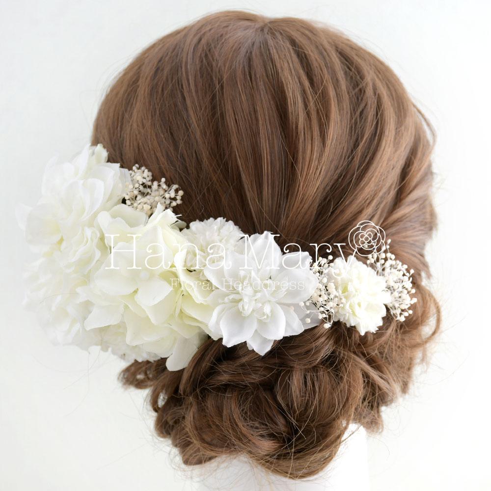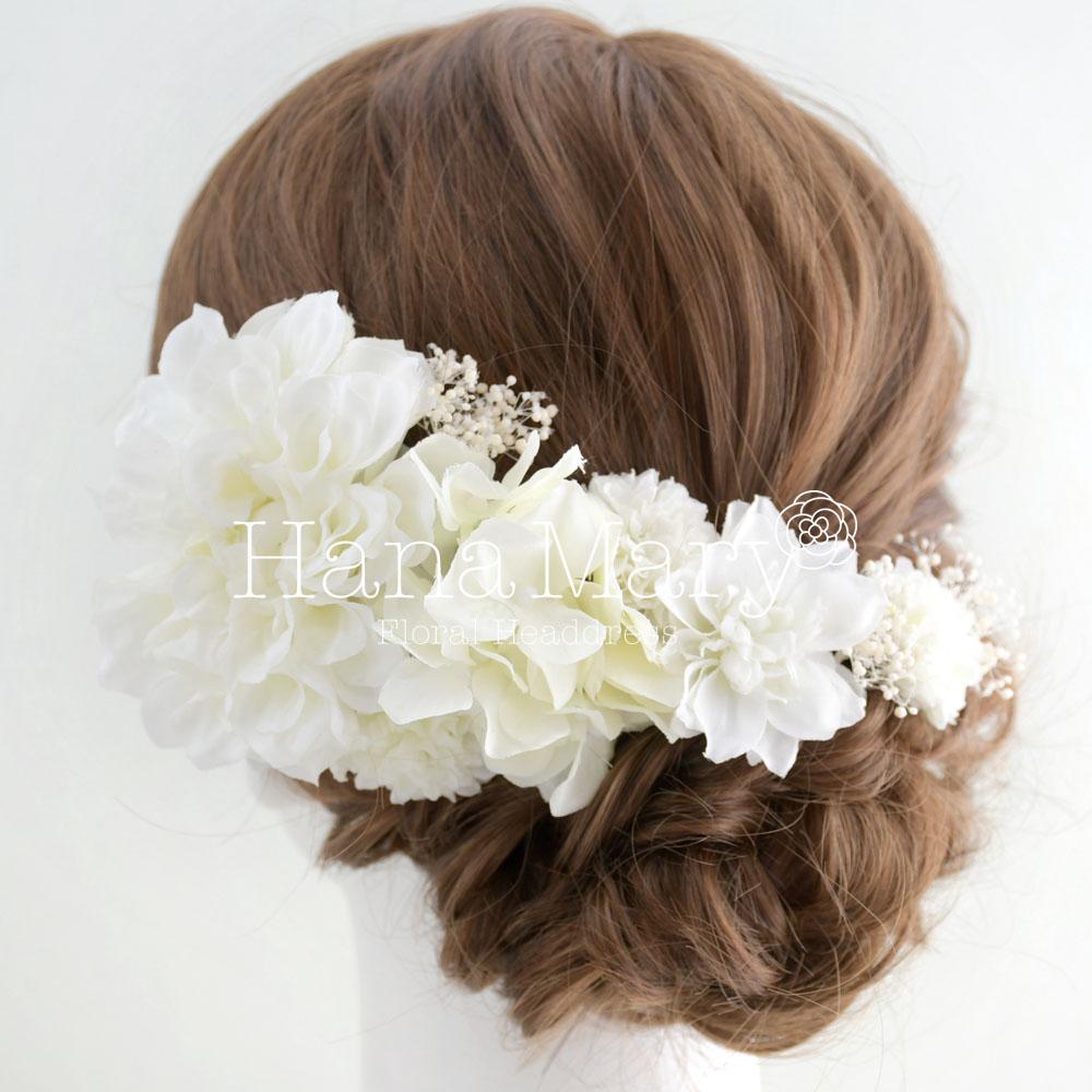 直径約9センチの白ダリアのお花をメインに紫陽花やマム、かすみ草など小花をあしらいアレンジしたヘアブーケです。