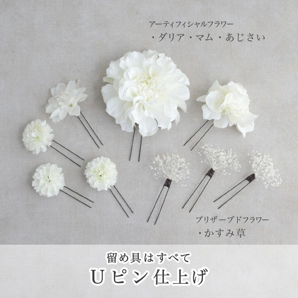 その日のヘアスタイルによって自由に一輪一輪配置できます。お花の数が多い場合でも、アメピンを追加して簡単にしっかりと固定できます。