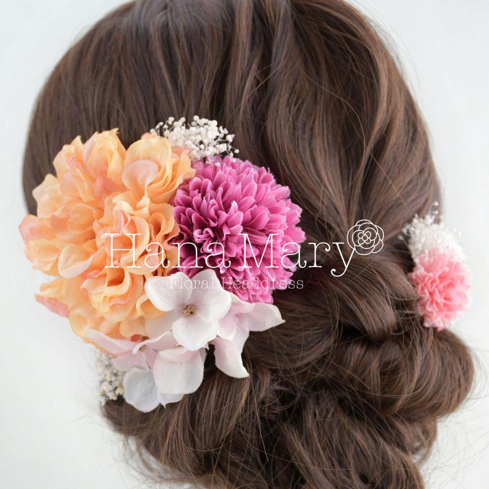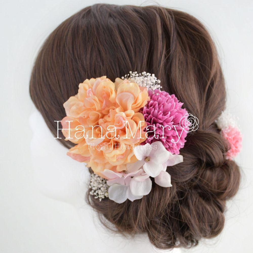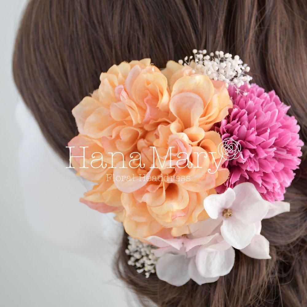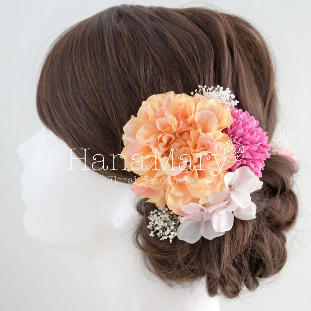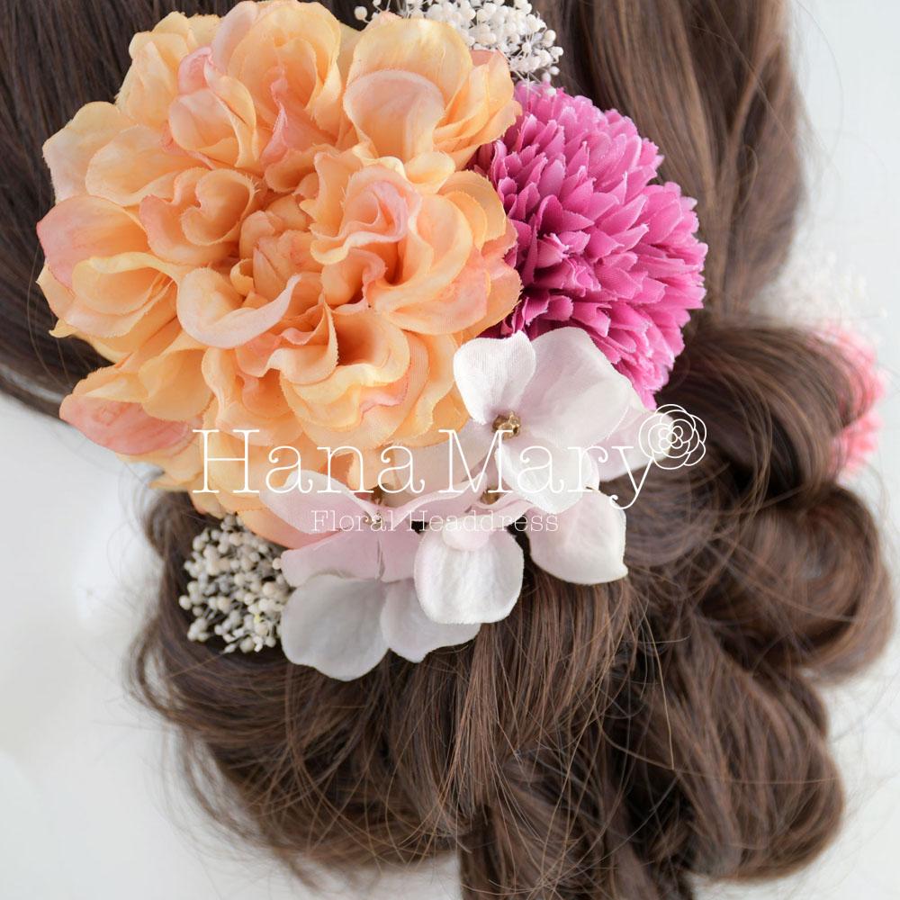 ピーチカラーの花弁にわずかに混じる淡桃色が美しいダリアのお花をメインにマムとあじさいで彩られた華やかな髪飾り。