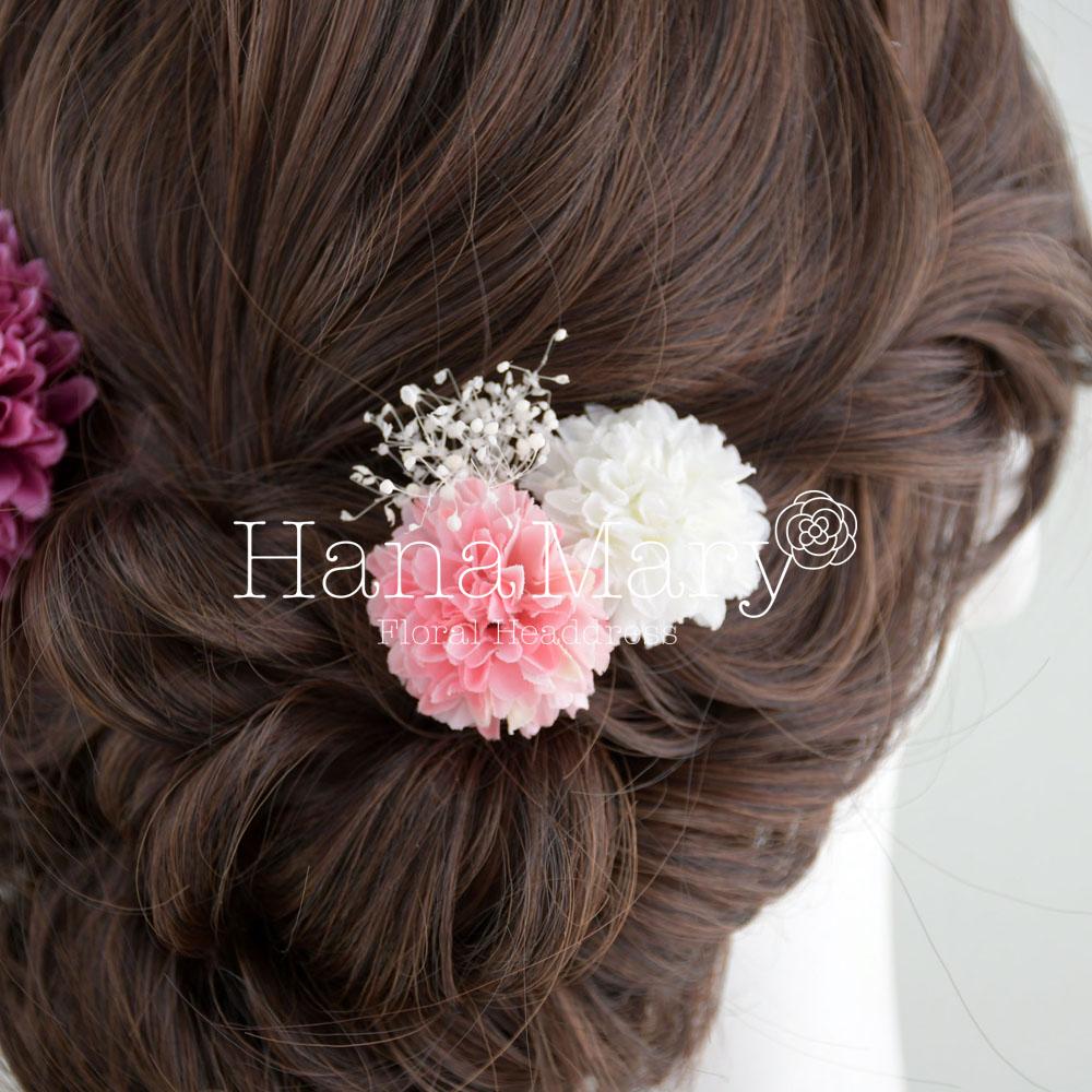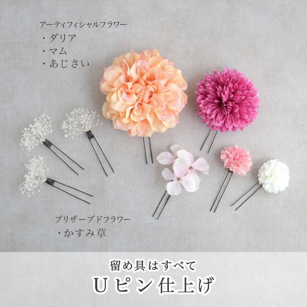 その日のヘアスタイルによって自由に一輪一輪配置できます。お花の数が多い場合でも、アメピンを追加して簡単にしっかりと固定できます。