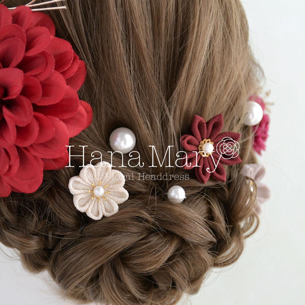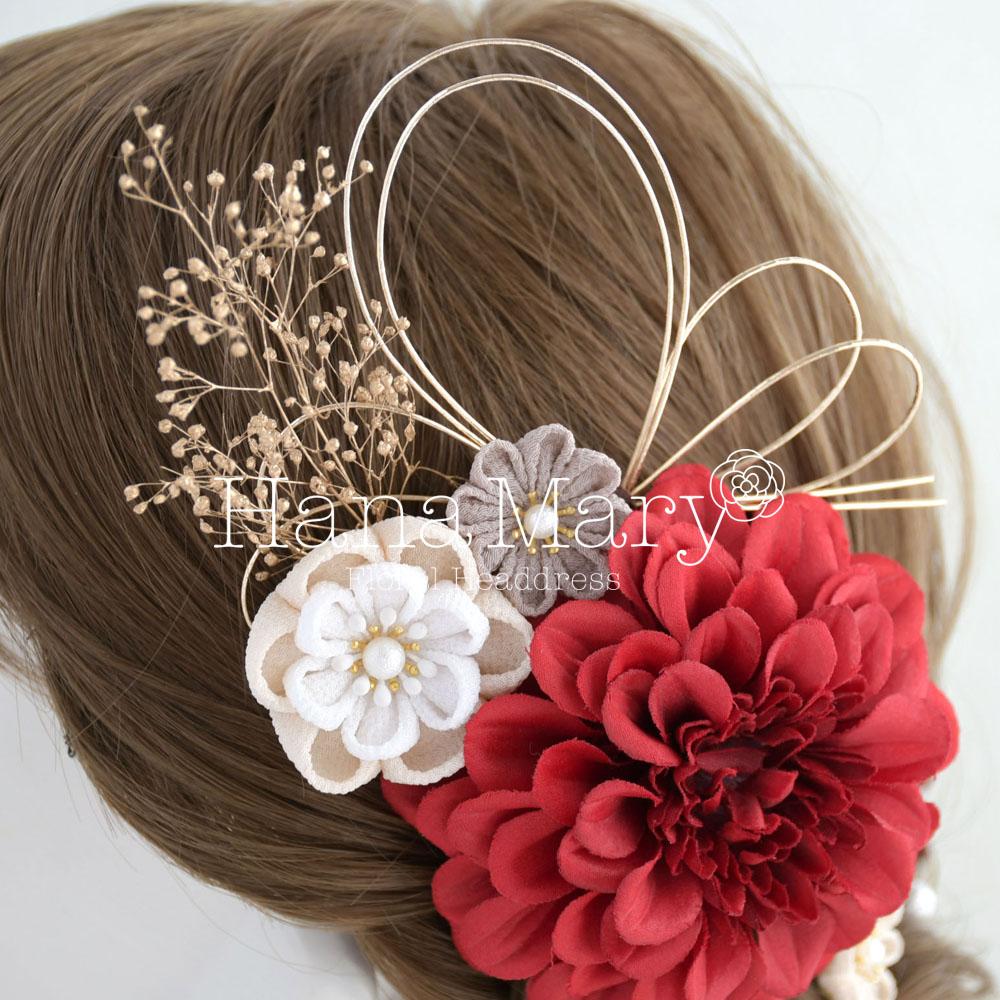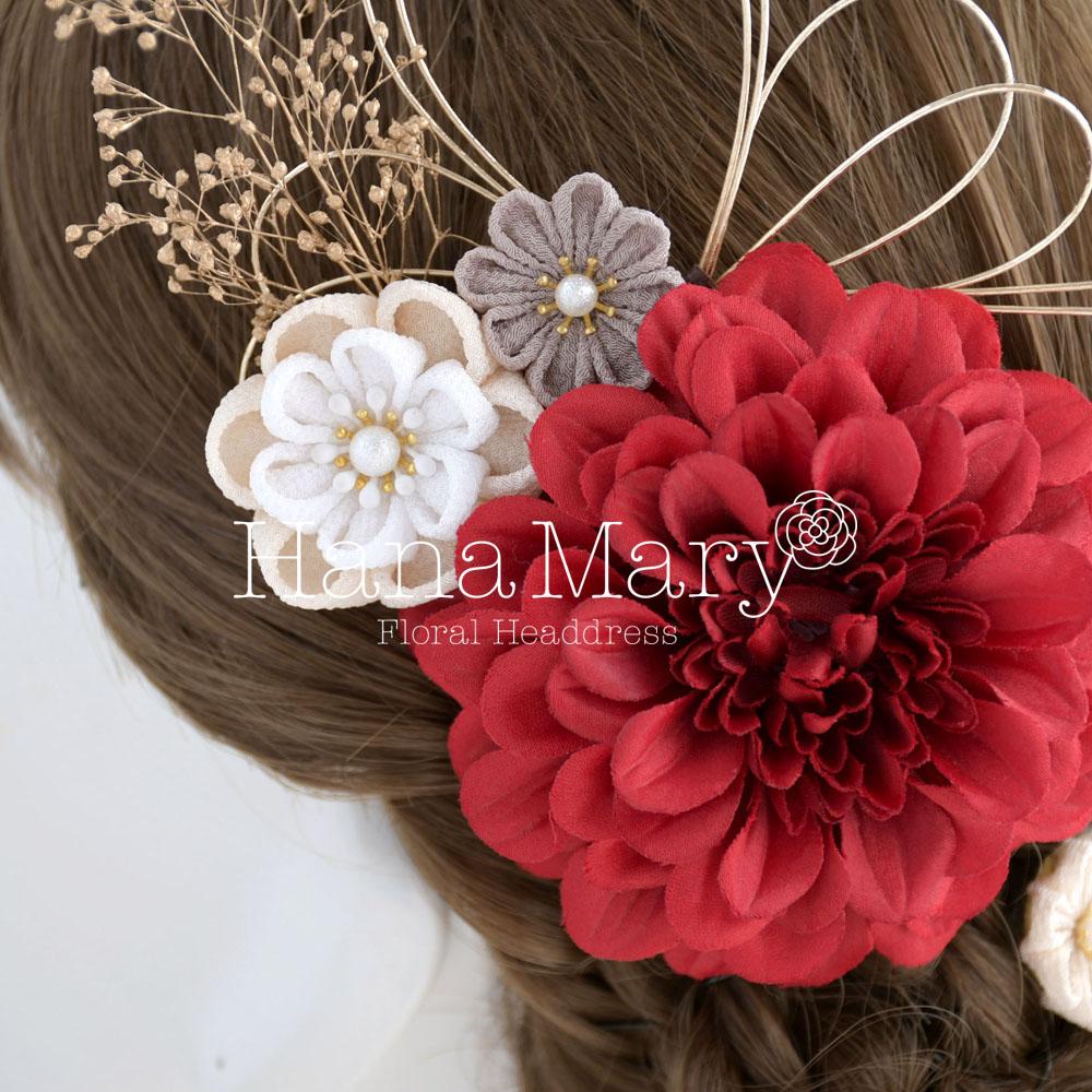 ジニアとつまみ細工【赤 白】成人式 卒業式 結婚式 振袖 袴 髪飾り 着物 和装