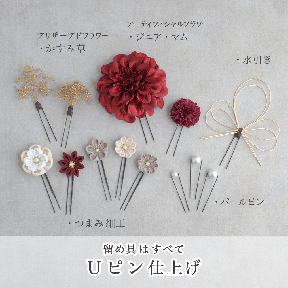 その日のヘアスタイルによって自由に一輪一輪配置できます。お花の数が多い場合でも、アメピンを追加して簡単にしっかりと固定できます。