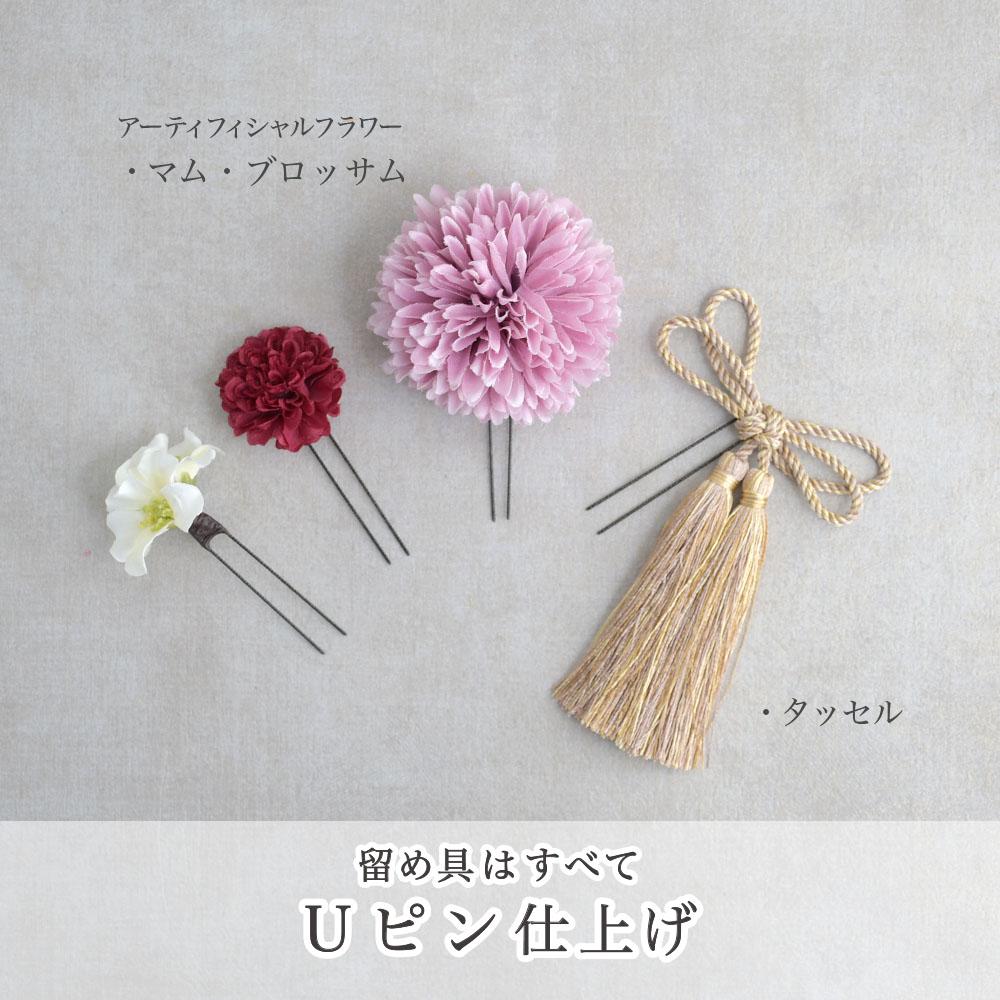 その日のヘアスタイルによって自由に一輪一輪配置できます。お花の数が多い場合でも、アメピンを追加して簡単にしっかりと固定できます。