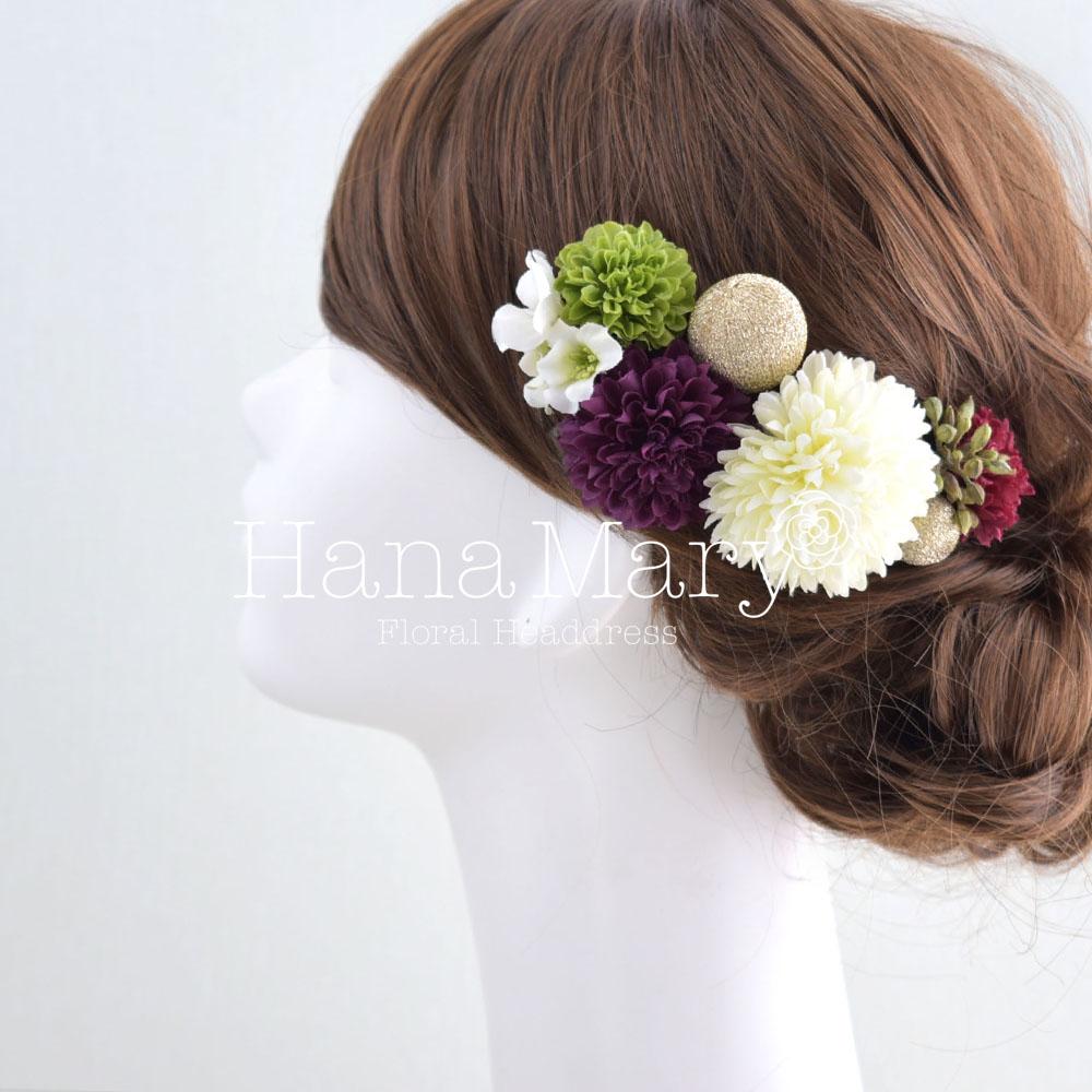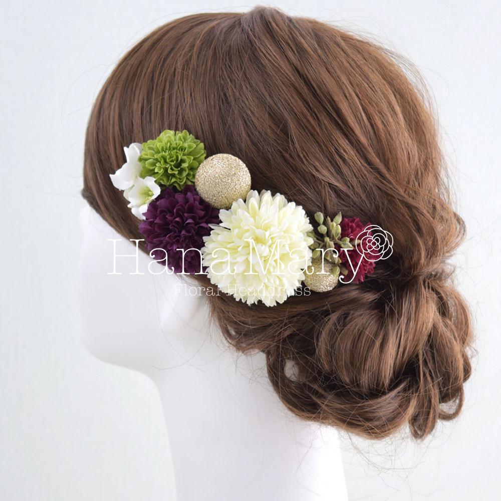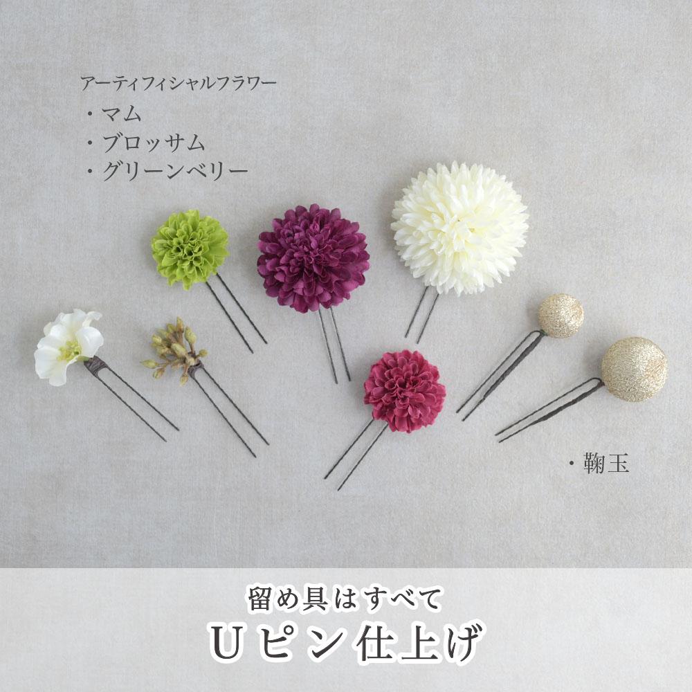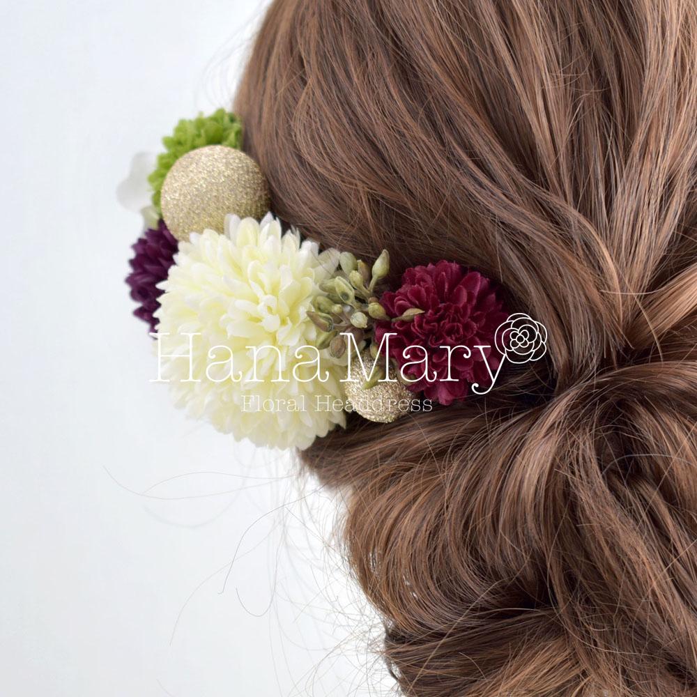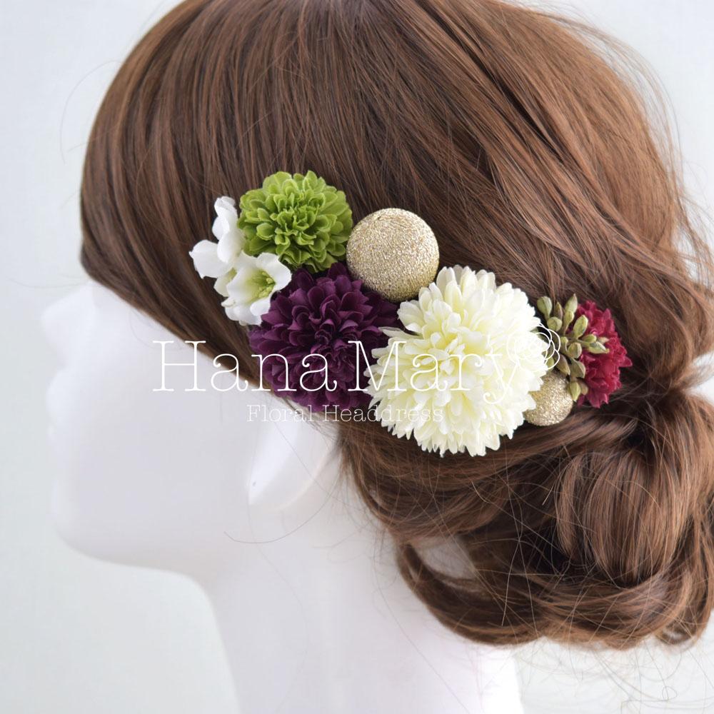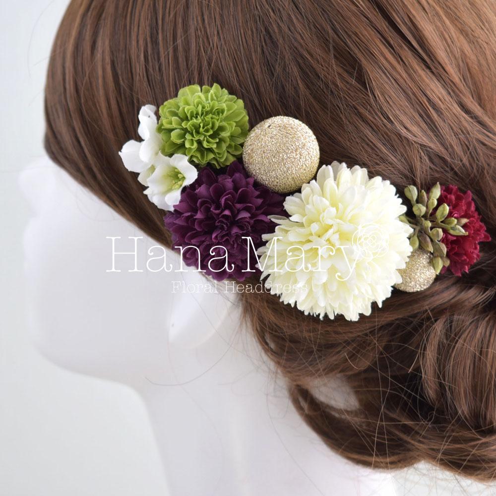 上質なプレミアムマムとピンポンマム、ブロッサムにゴールドの鞠を添えてアレンジした和モダンな髪飾りです。
