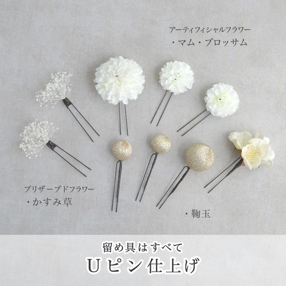 その日のヘアスタイルによって自由に一輪一輪配置できます。お花の数が多い場合でも、アメピンを追加して簡単にしっかりと固定できます。