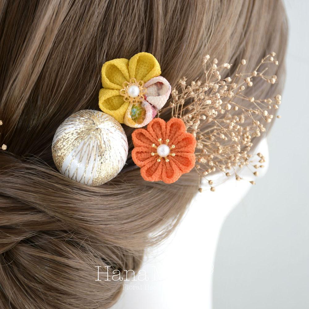 サンカラーのカラーリングが明るく晴れやかなムードを演出。和柄を絡ませた、からし色と柿色のつまみ細工はハナマリーだけのオリジナルデザインです。