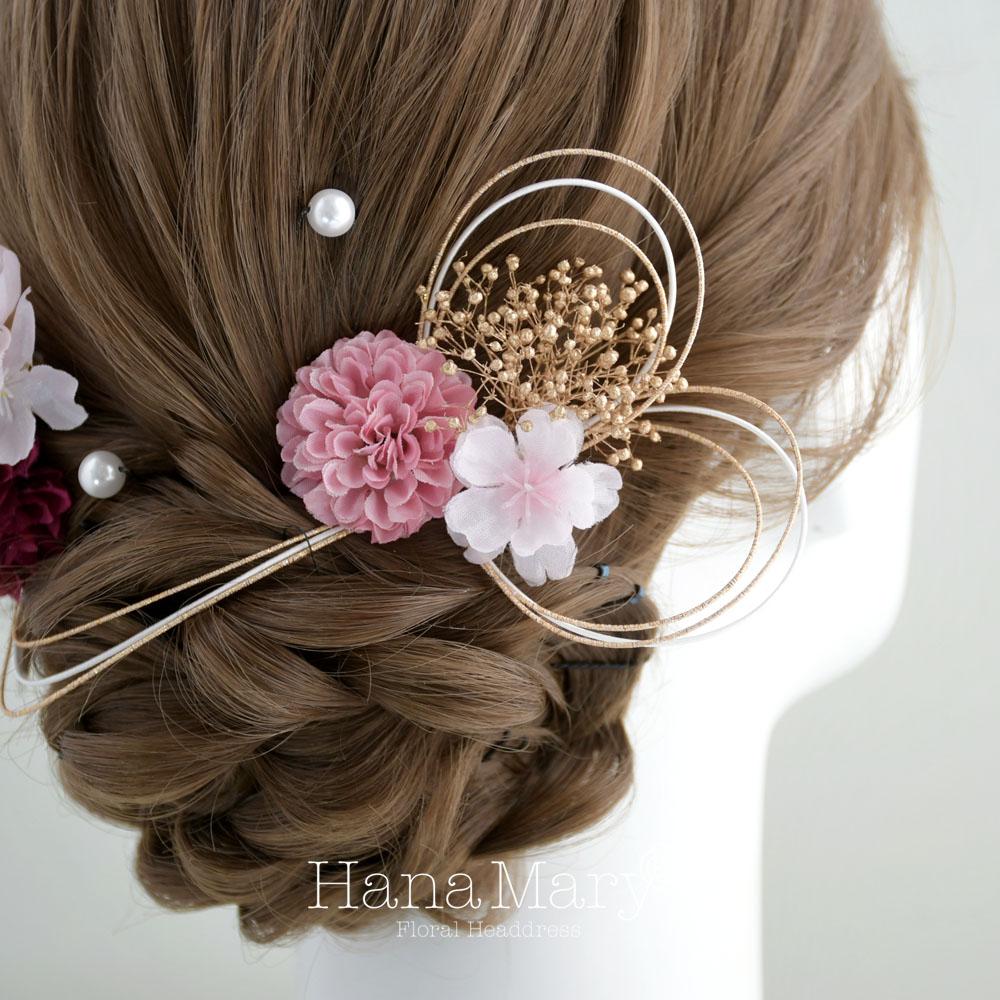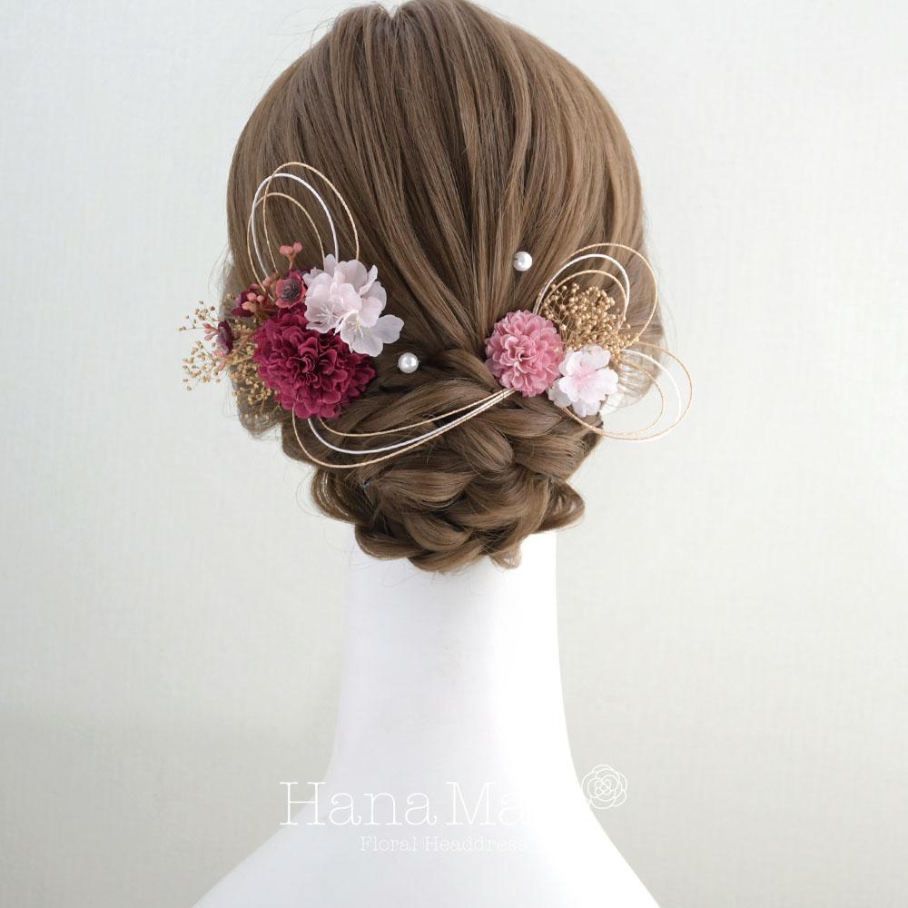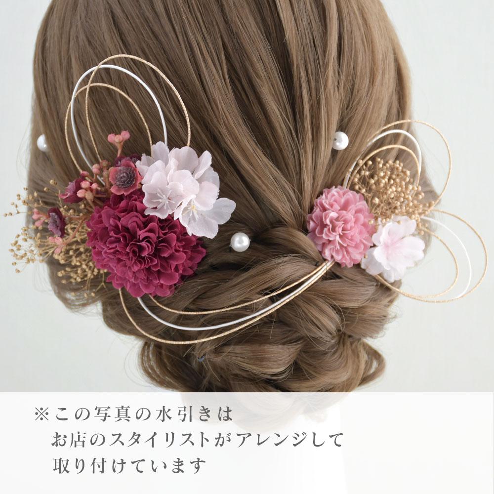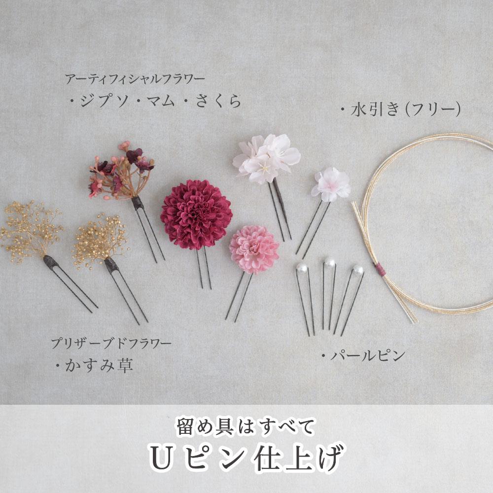 さくらとマムというトラッドな和スタイルながらも、水引きやかすみ草、パールピンなどで飾った和モダンな髪飾り。