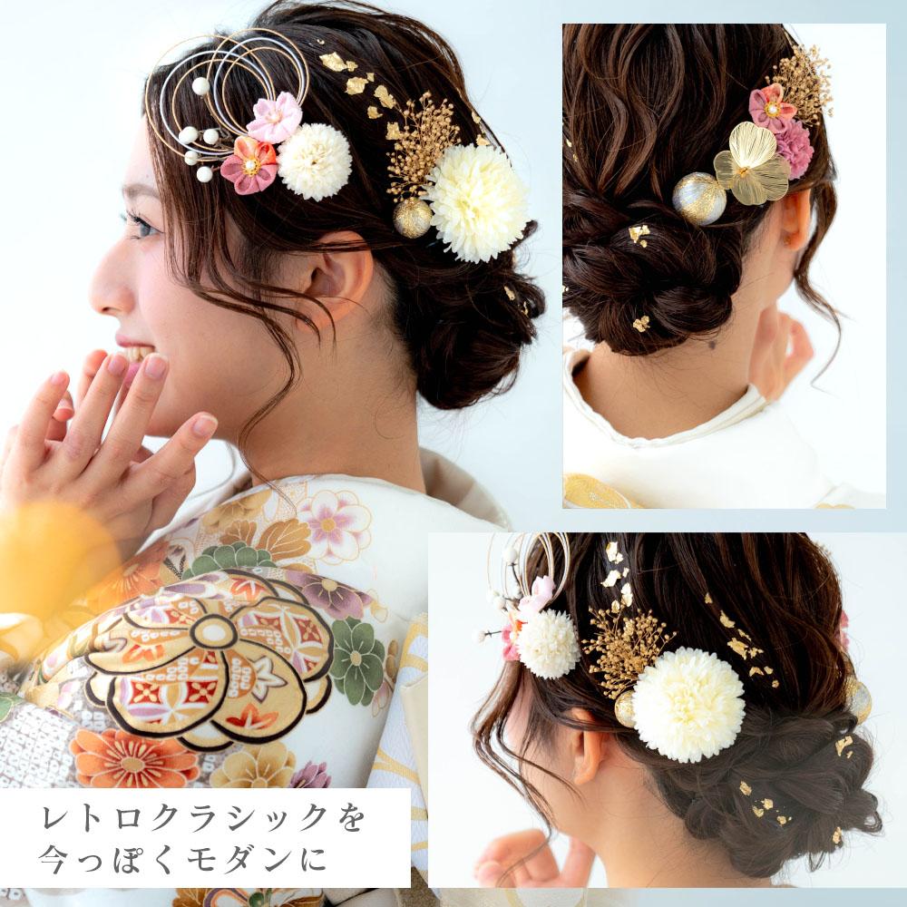 その日のヘアスタイルによって自由に一輪一輪配置できます。お花の数が多い場合でも、アメピンを追加して簡単にしっかりと固定できます。
