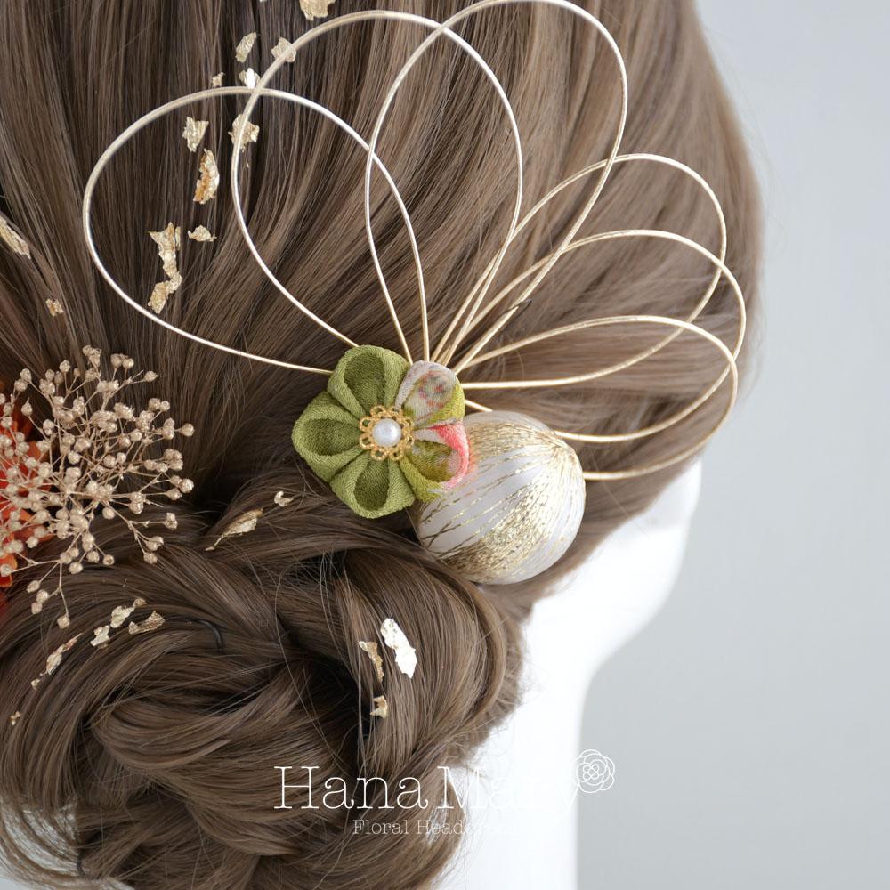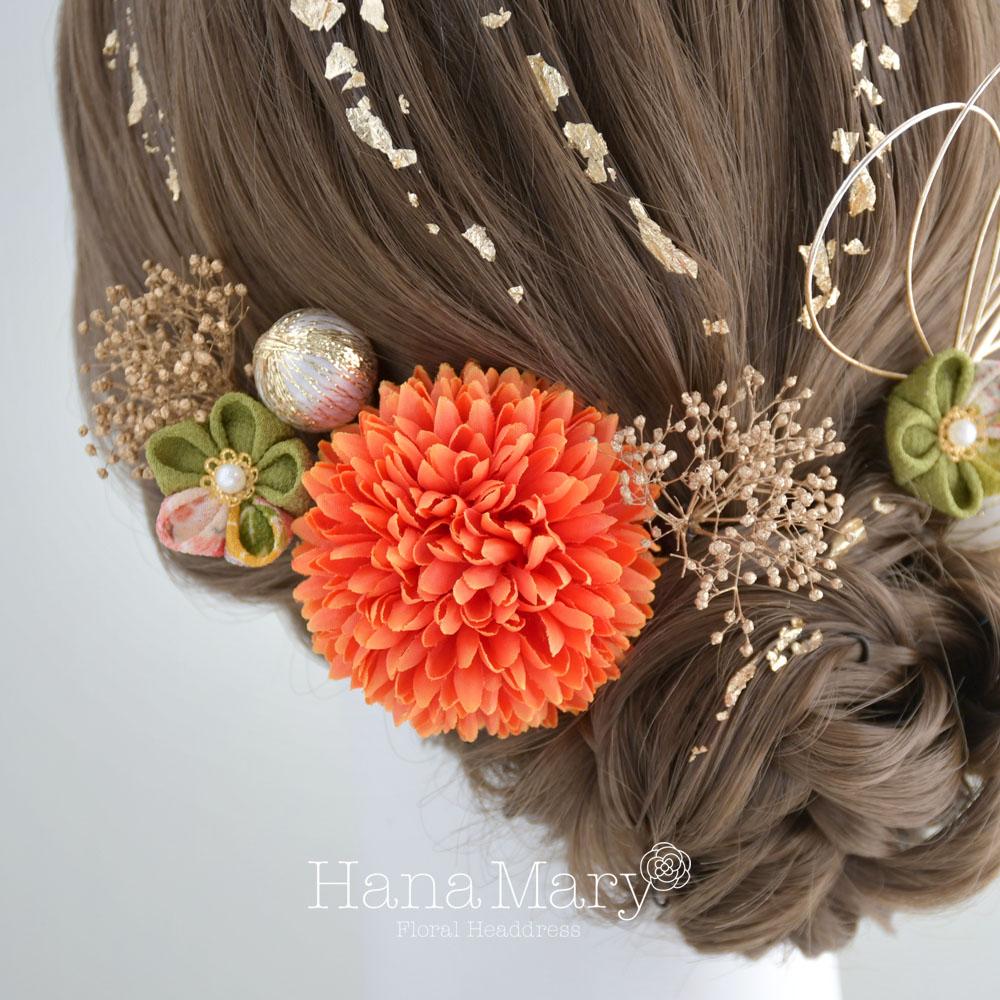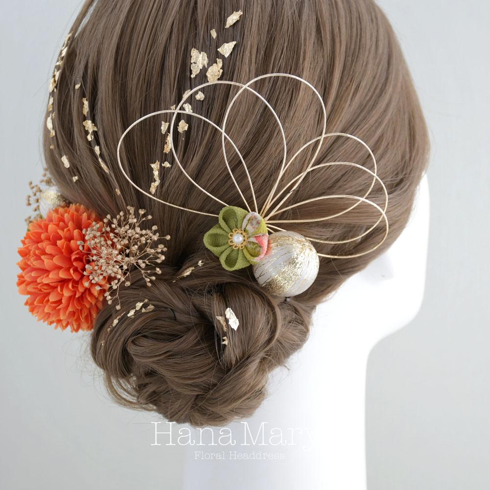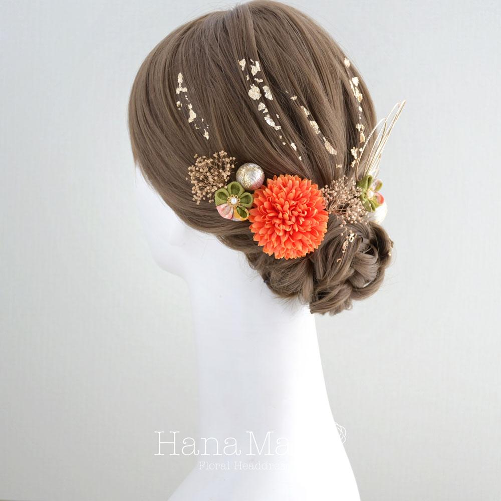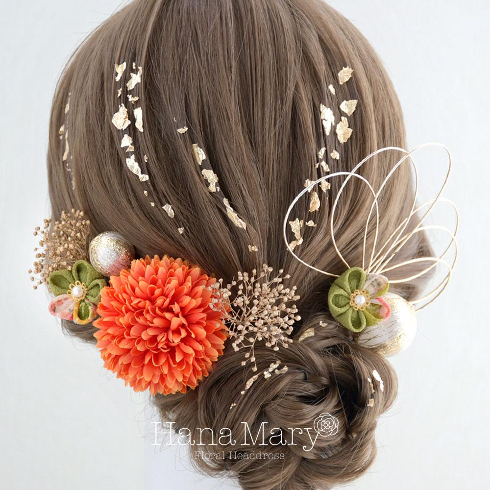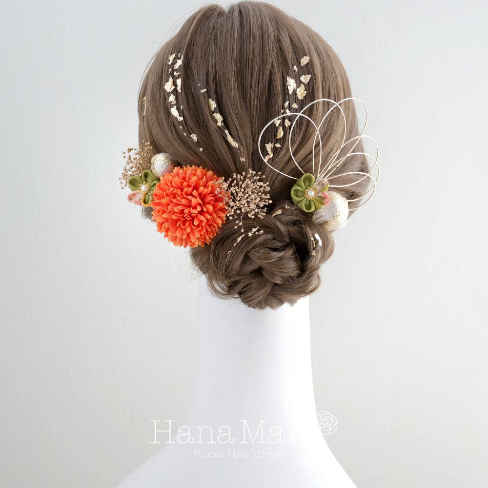 マム オレンジ 緑 髪飾り 卒業式 袴 成人式 振袖 着物 和装 水引き 和玉