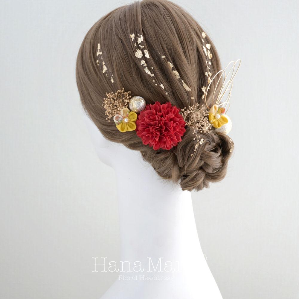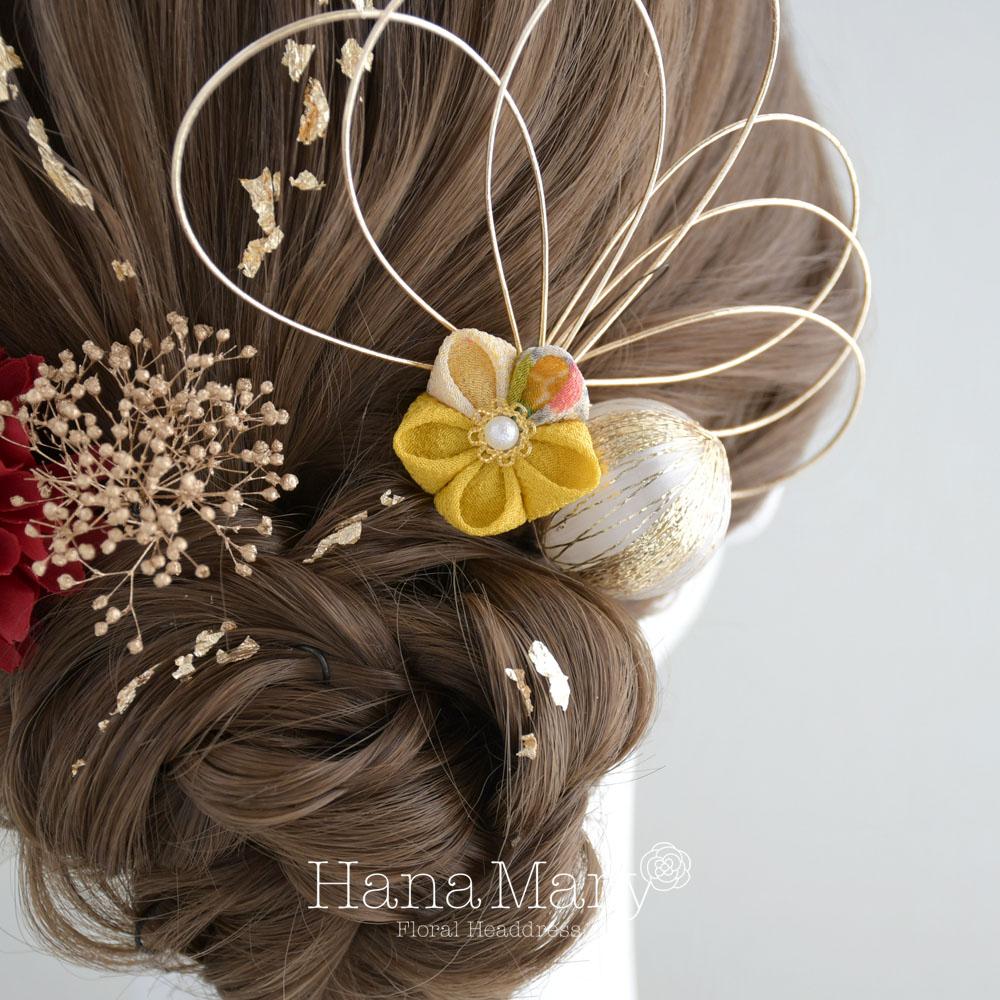 今っぽいタイトシニヨンや和髪に似合うよう、鞠玉と和柄のつまみ細工で合わせた髪飾り。