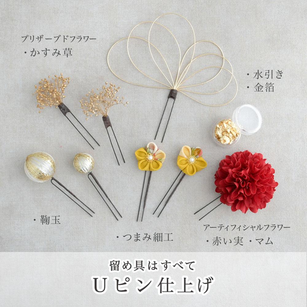 その日のヘアスタイルによって自由に一輪一輪配置できます。お花の数が多い場合でも、アメピンを追加して簡単にしっかりと固定できます。