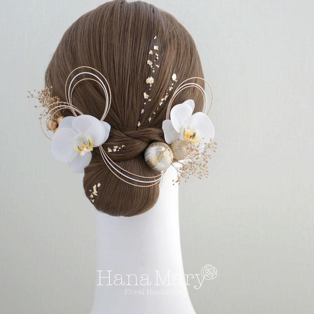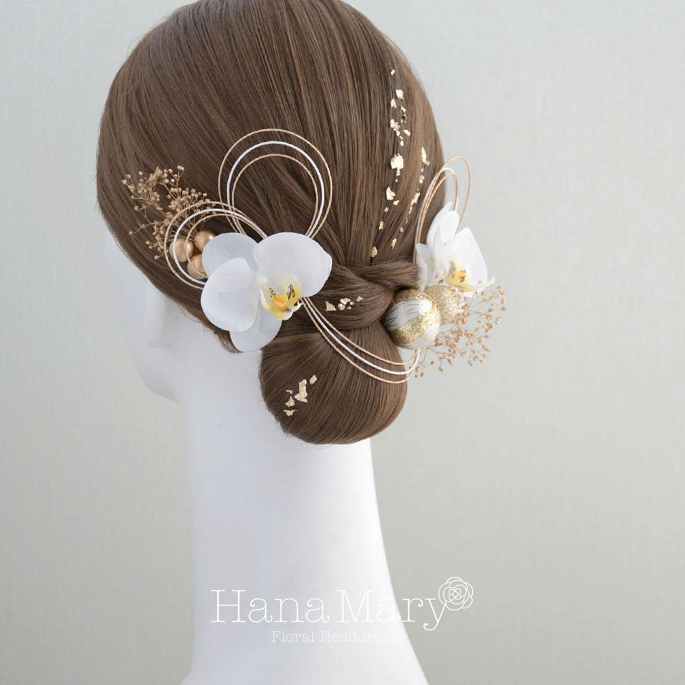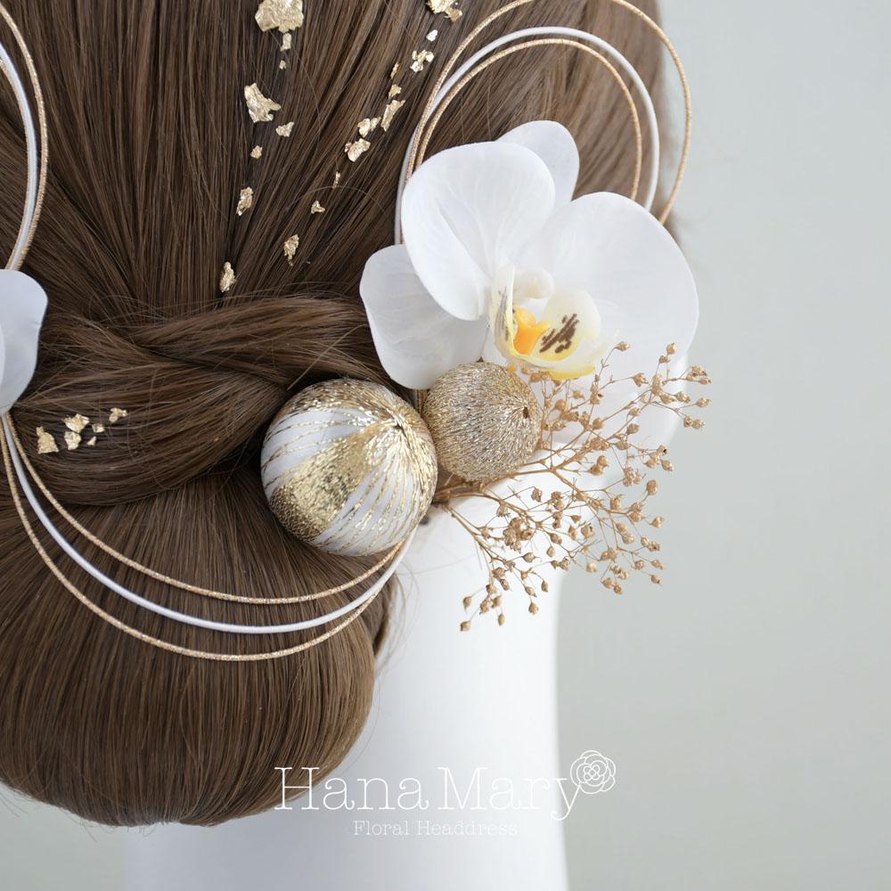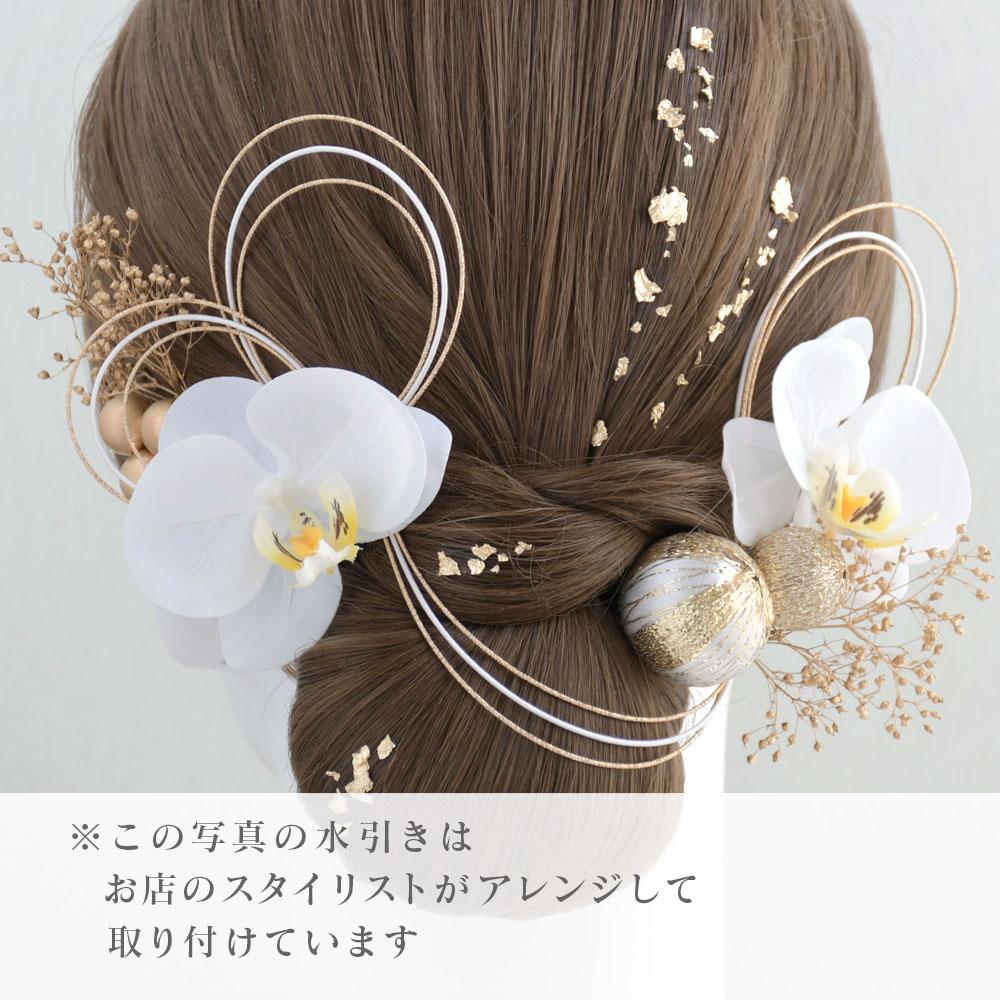 胡蝶蘭と鞠玉 髪飾り 卒業式 成人式 振袖 袴 着物 結婚式【白】水引き