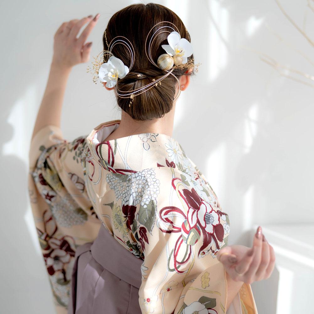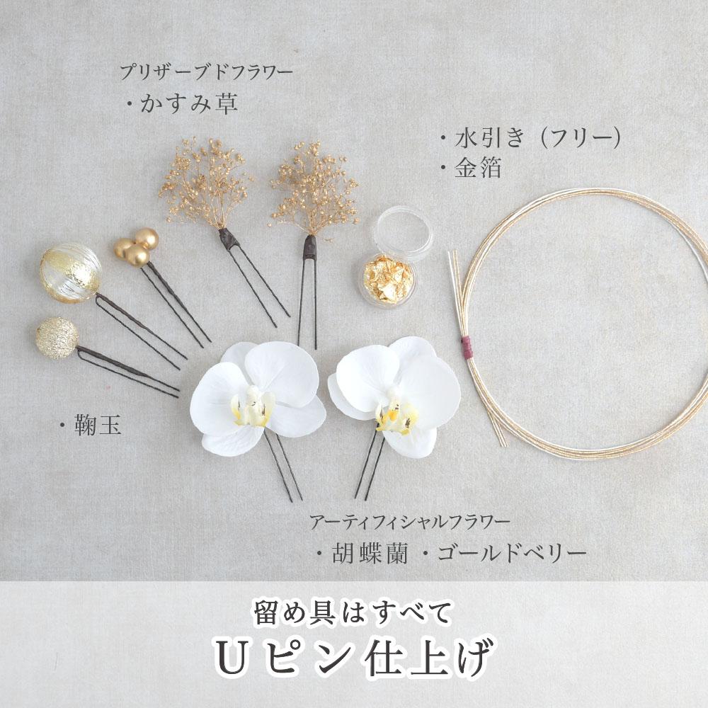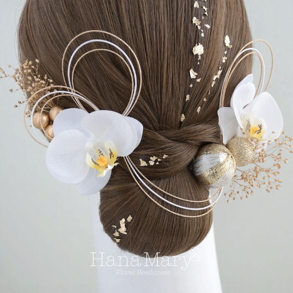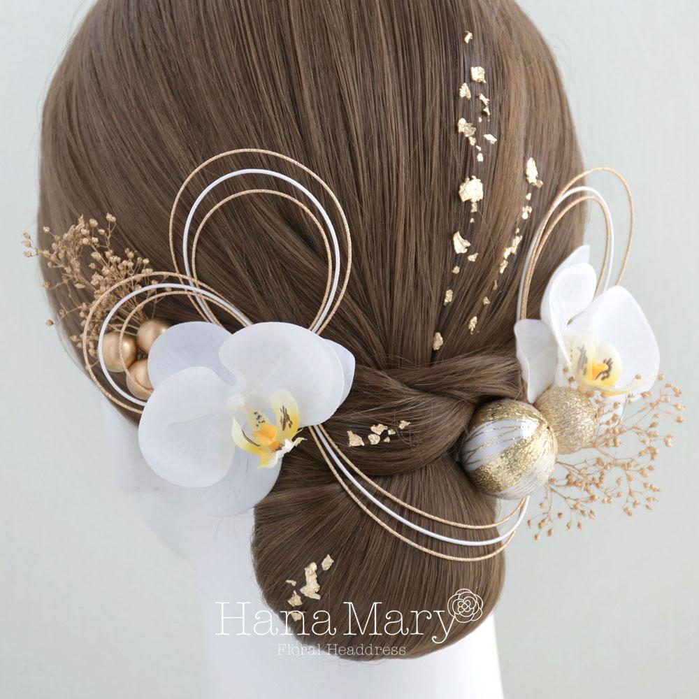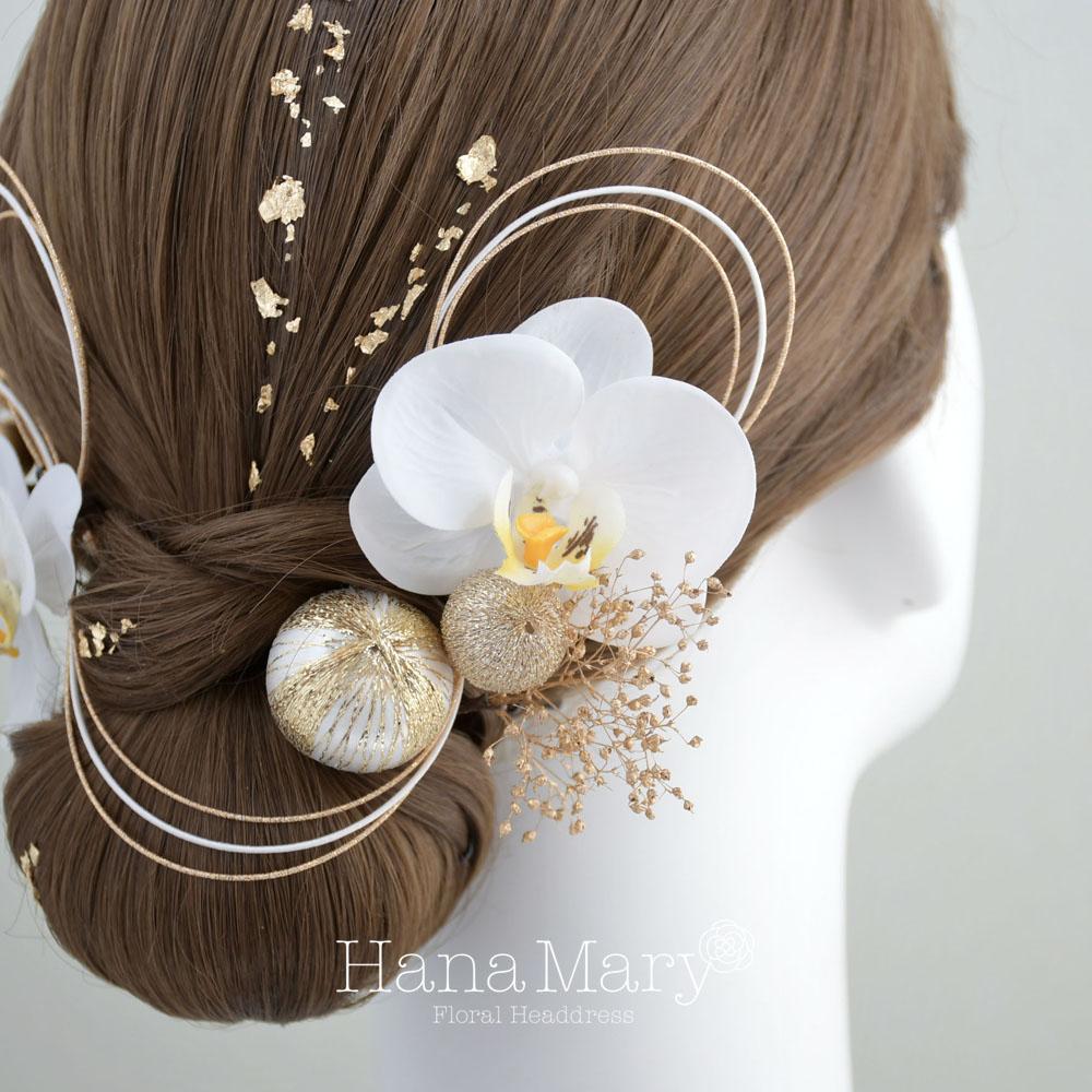 胡蝶蘭と鞠玉 髪飾り 卒業式 成人式 振袖 袴 着物 結婚式【白】水引き