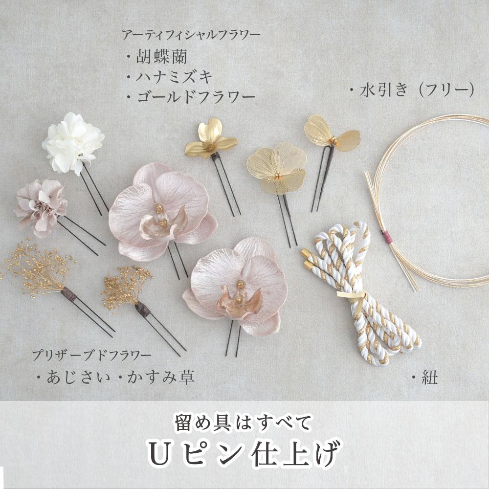 その日のヘアスタイルによって自由に一輪一輪配置できます。お花の数が多い場合でも、アメピンを追加して簡単にしっかりと固定できます。