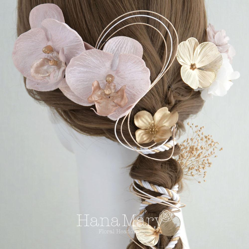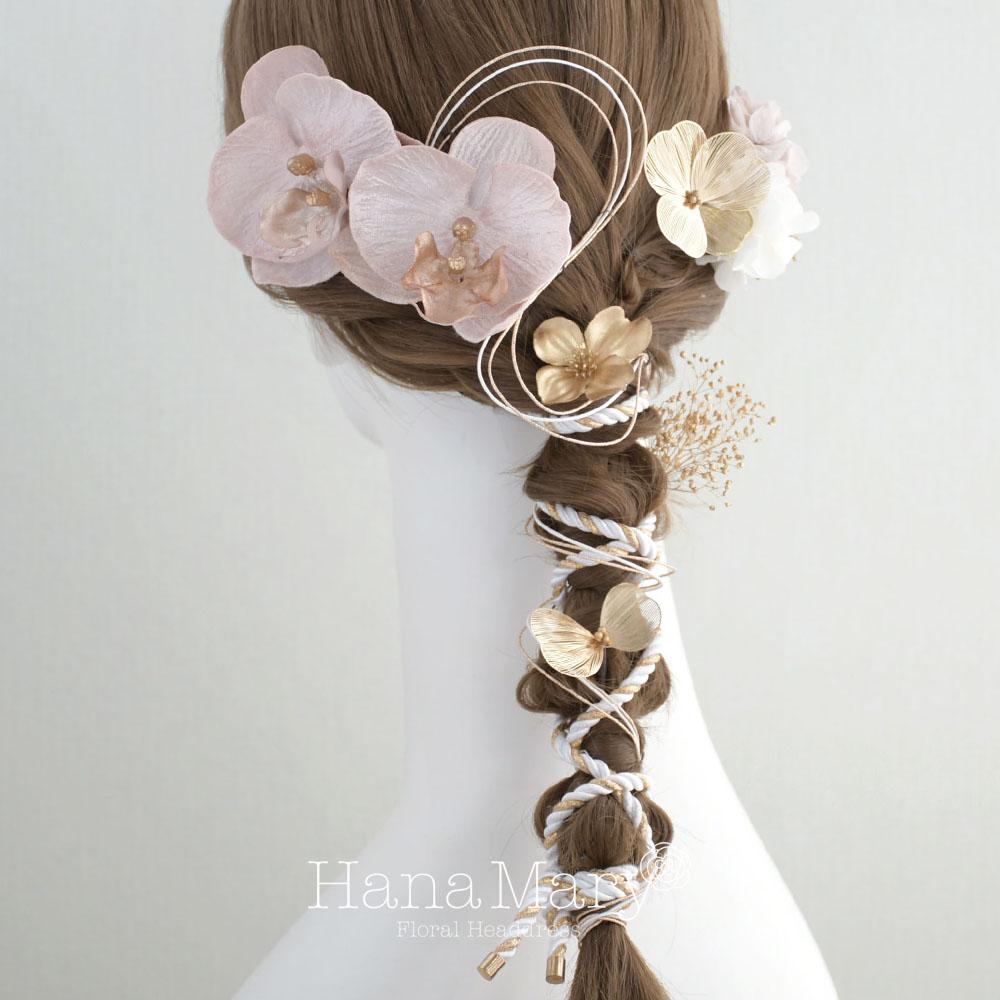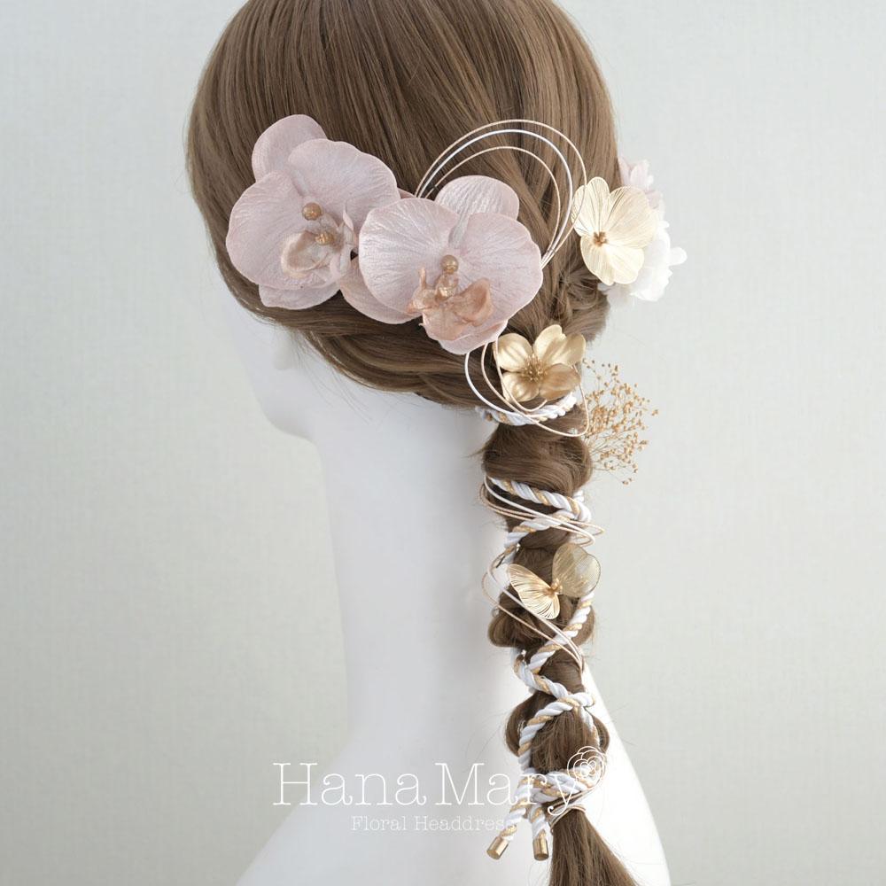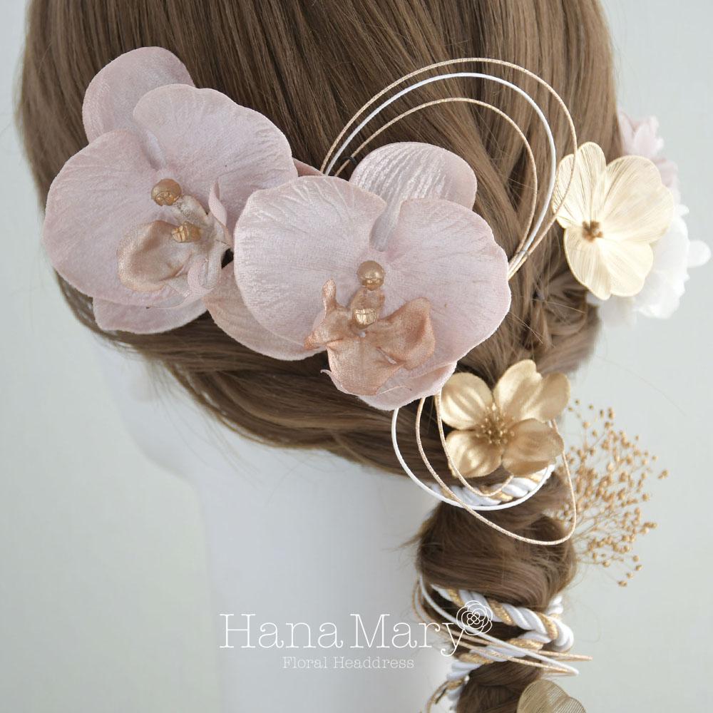 上品で可愛らしい胡蝶蘭のお花を、あみ下ろしのヘアに合うようアレンジした髪飾りです。