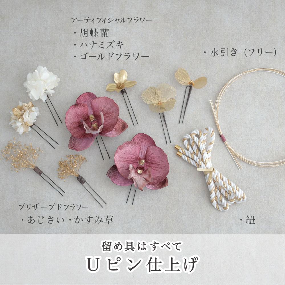 その日のヘアスタイルによって自由に一輪一輪配置できます。お花の数が多い場合でも、アメピンを追加して簡単にしっかりと固定できます。