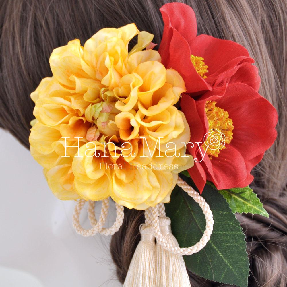 鮮やかな黄ダリアに可愛い椿のお花を合わせ、より晴れやかにモダンに彩るヘアブーケ。