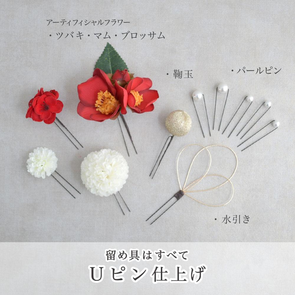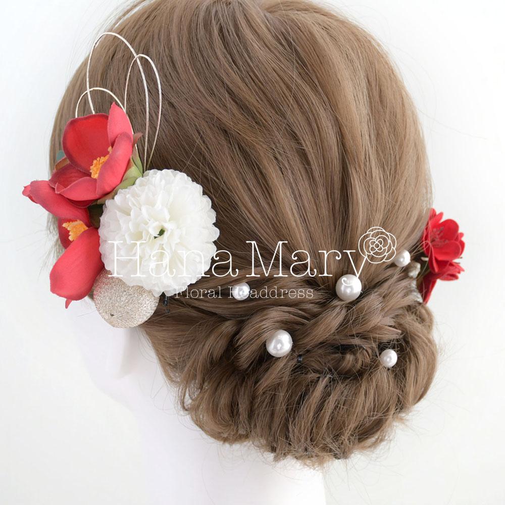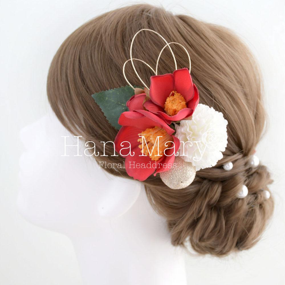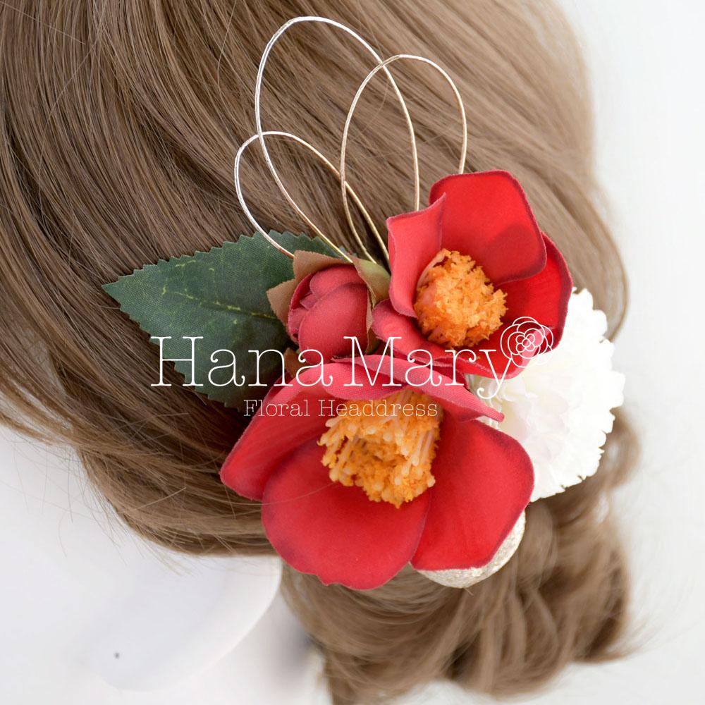 ベーシックな椿の髪飾りを、お花とパールピンで華やかに彩った人気の髪飾りです。
