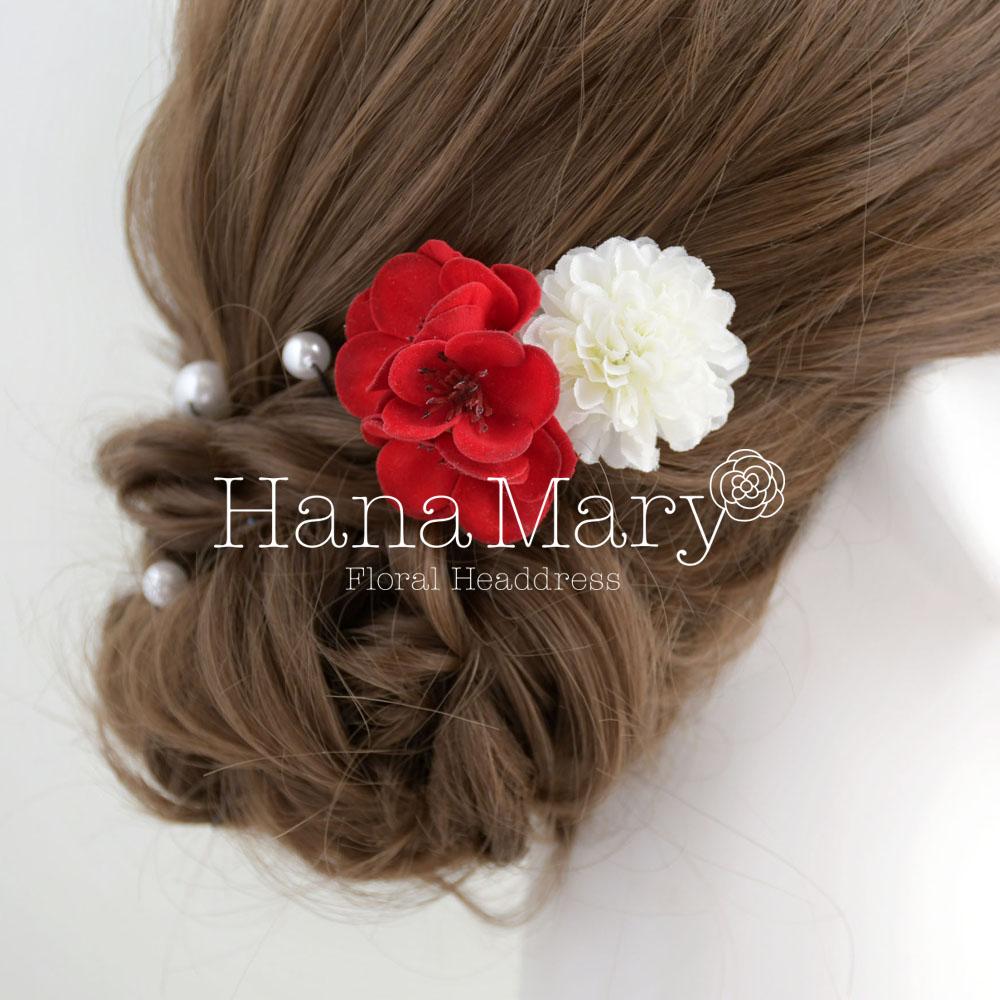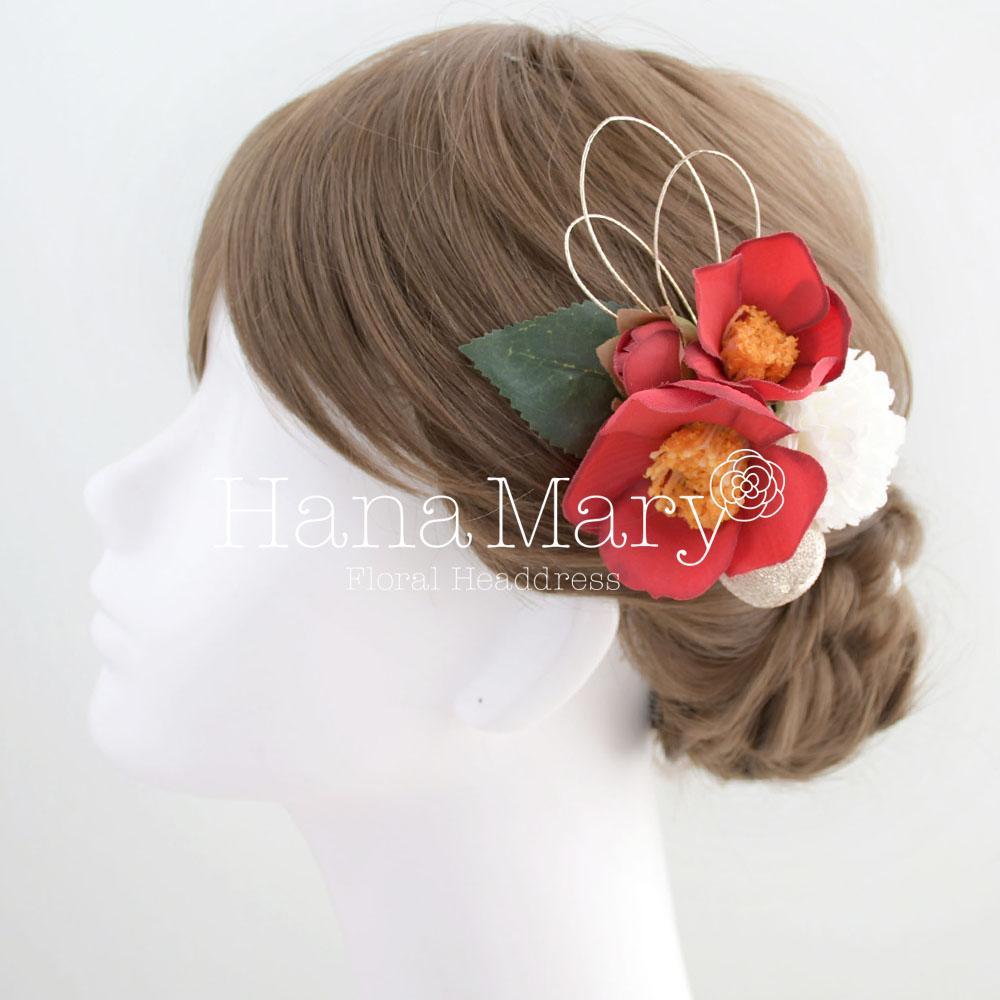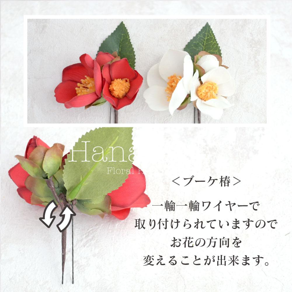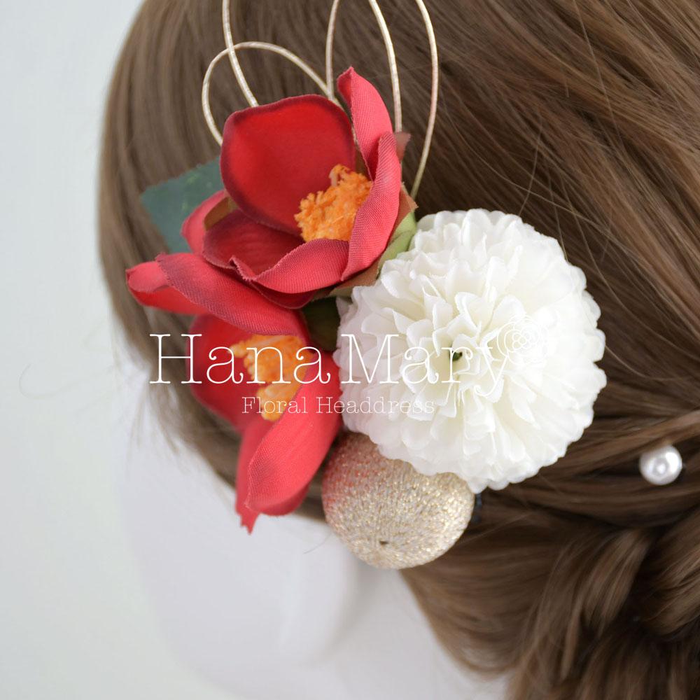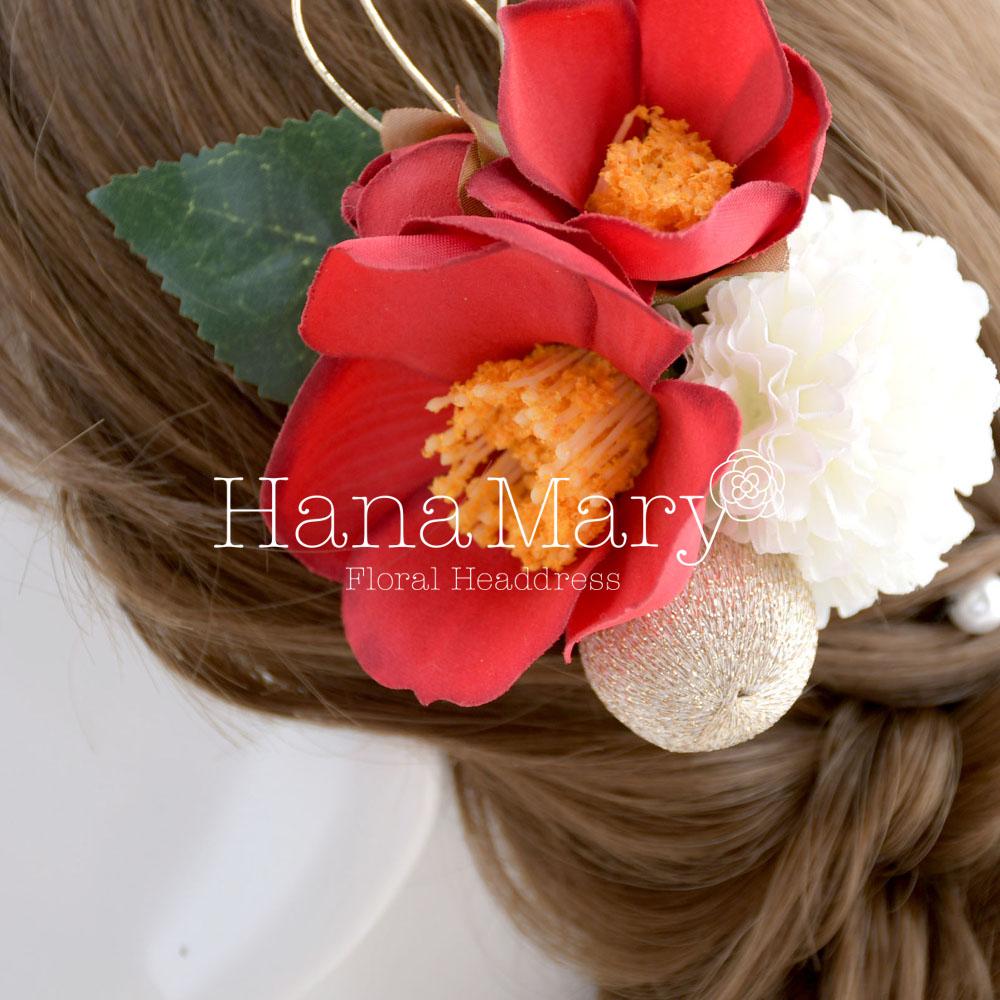 ベーシックな椿の髪飾りを、お花とパールピンで華やかに彩った人気の髪飾りです。