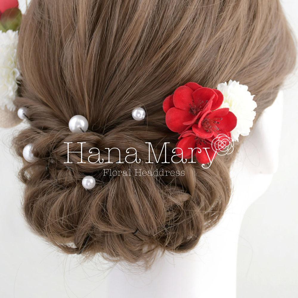 赤い椿とマム、パールピンで華やかに 成人式 卒業式 和装 髪飾り