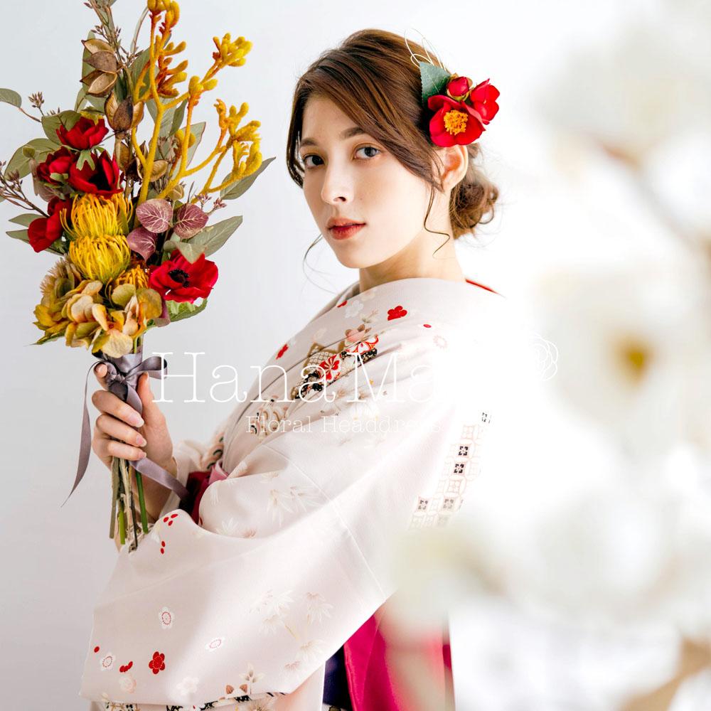 HanaMaryの髪飾りは生花をリアルに再現したアートフラワーと呼ばれるハイクオリティーな造花を使用しています。耐久性に優れ、成人式・卒業式やウェディングなどに何度でも繰り返し使用することができます。