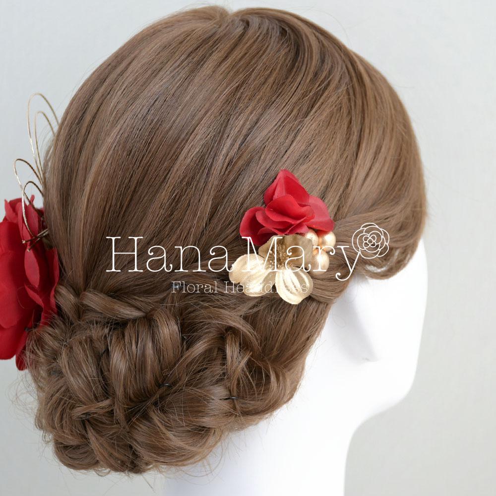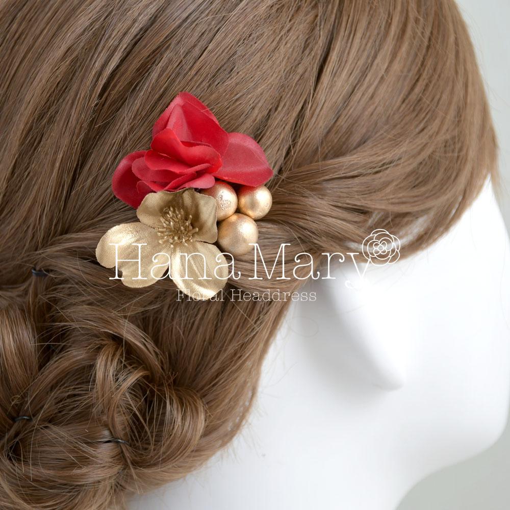 古典的でもありモダンな美しさもある可愛らしいお花。定番で使いやすいツバキのお花に、今シーズン人気の水引とゴールドのお花を散らし、今っぽく仕上げた髪飾りです。