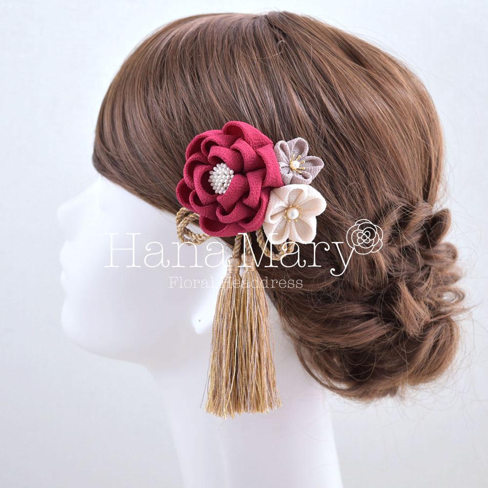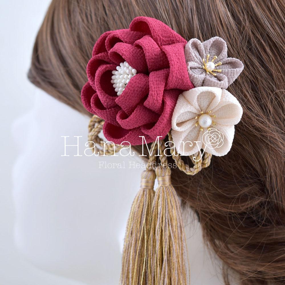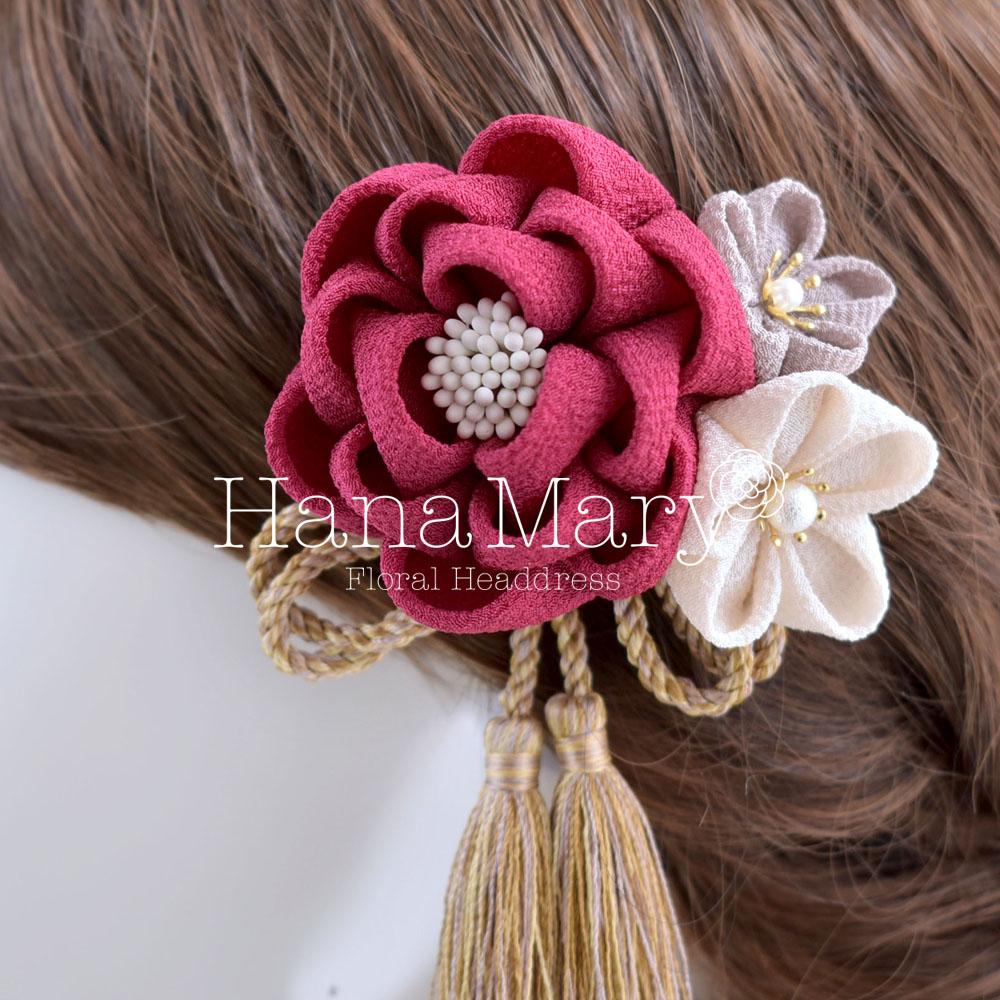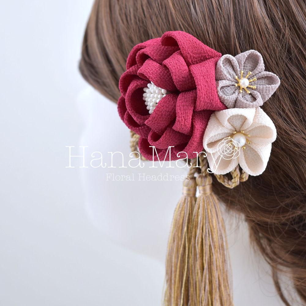 ボルドーカラーの椿 つまみ細工 髪飾り モダン