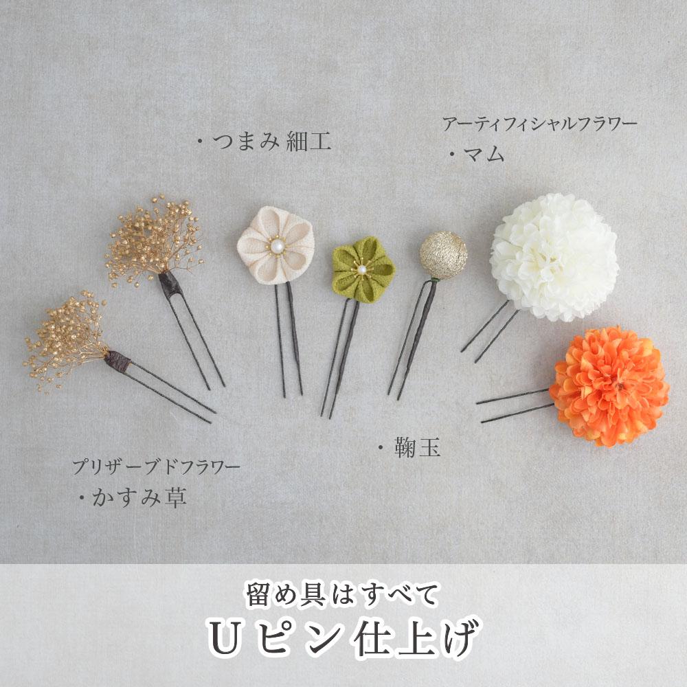 その日のヘアスタイルによって自由に一輪一輪配置できます。お花の数が多い場合でも、アメピンを追加して簡単にしっかりと固定できます。