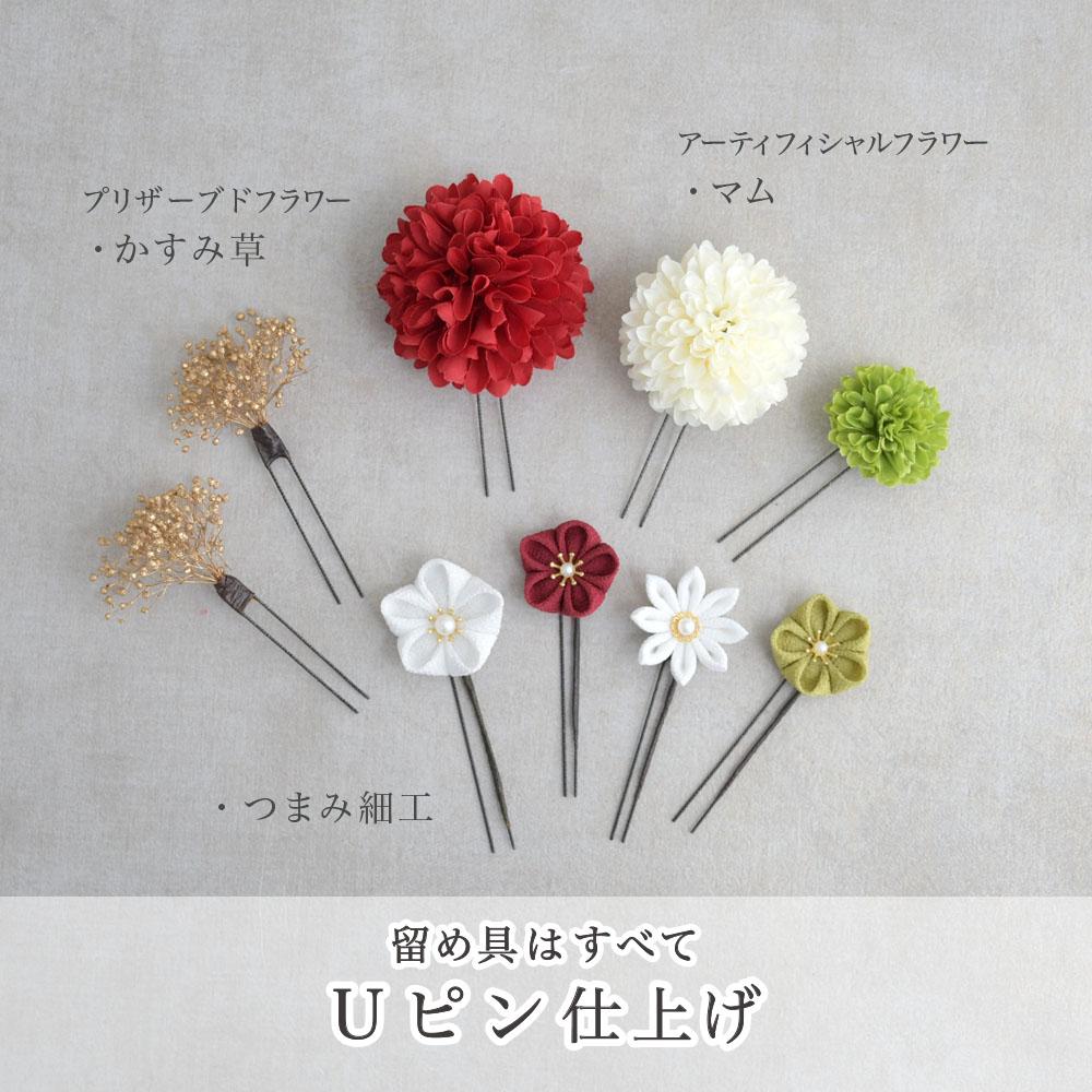 その日のヘアスタイルによって自由に一輪一輪配置できます。お花の数が多い場合でも、アメピンを追加して簡単にしっかりと固定できます。