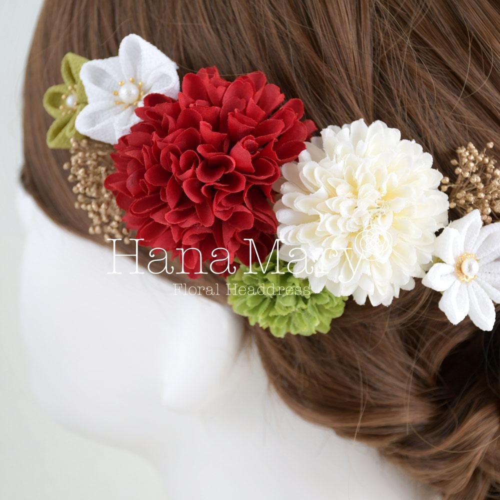 マムとつまみ細工、かすみ草でアレンジした和装髪飾り。