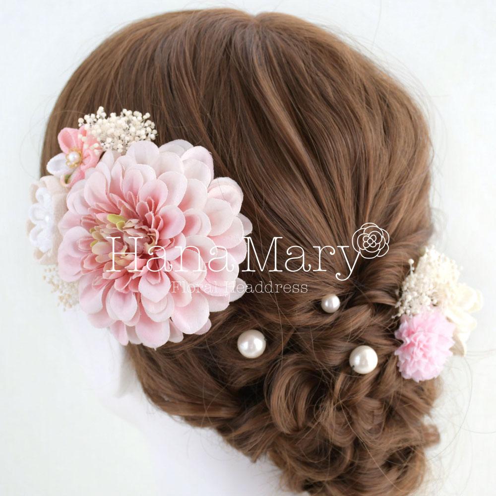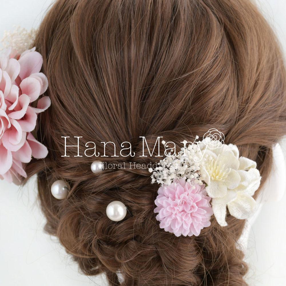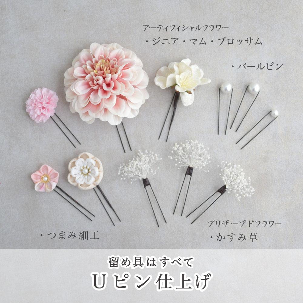 その日のヘアスタイルによって自由に一輪一輪配置できます。お花の数が多い場合でも、アメピンを追加して簡単にしっかりと固定できます。