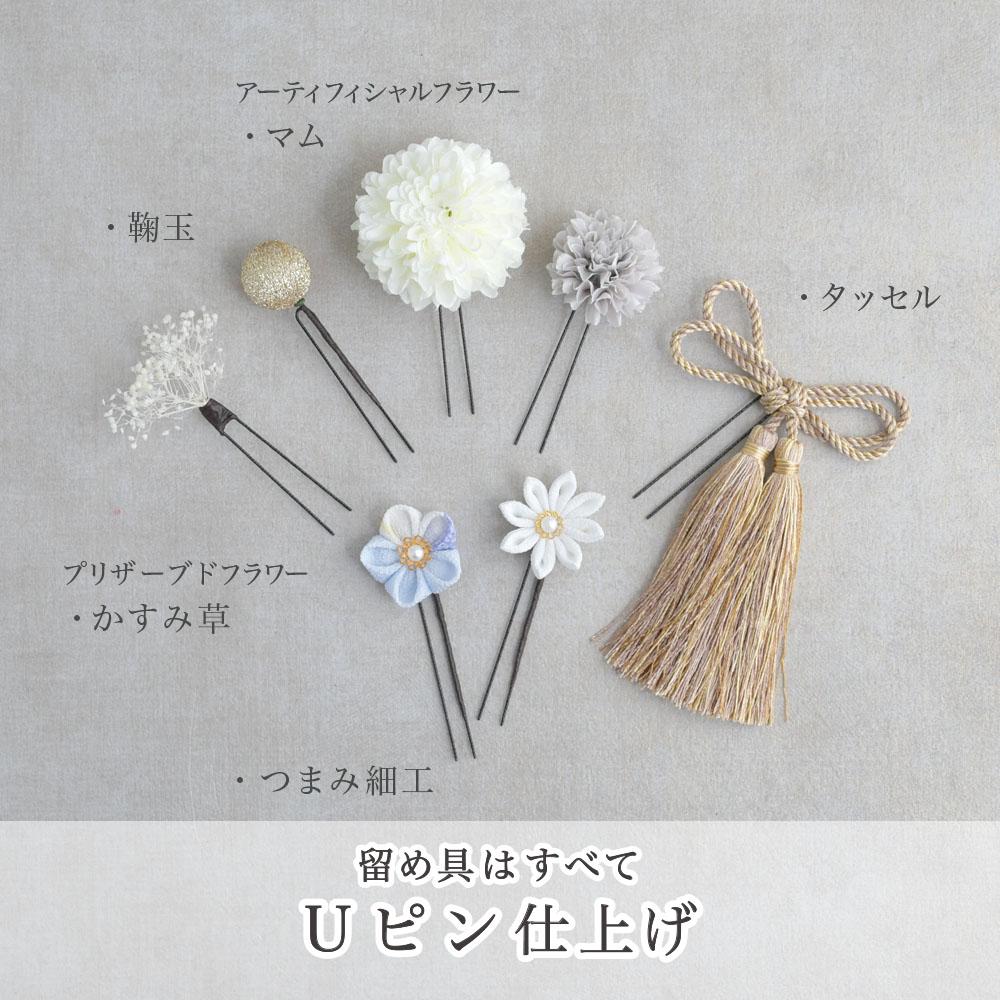 その日のヘアスタイルによって自由に一輪一輪配置できます。お花の数が多い場合でも、アメピンを追加して簡単にしっかりと固定できます。