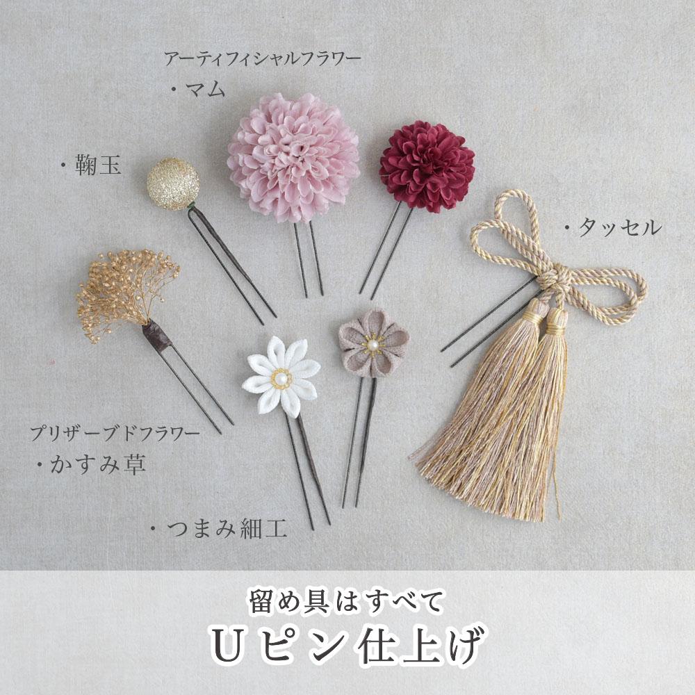 その日のヘアスタイルによって自由に一輪一輪配置できます。お花の数が多い場合でも、アメピンを追加して簡単にしっかりと固定できます。
