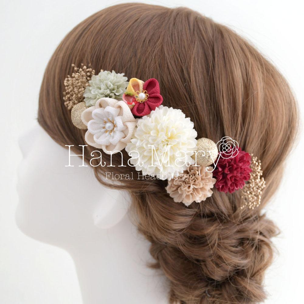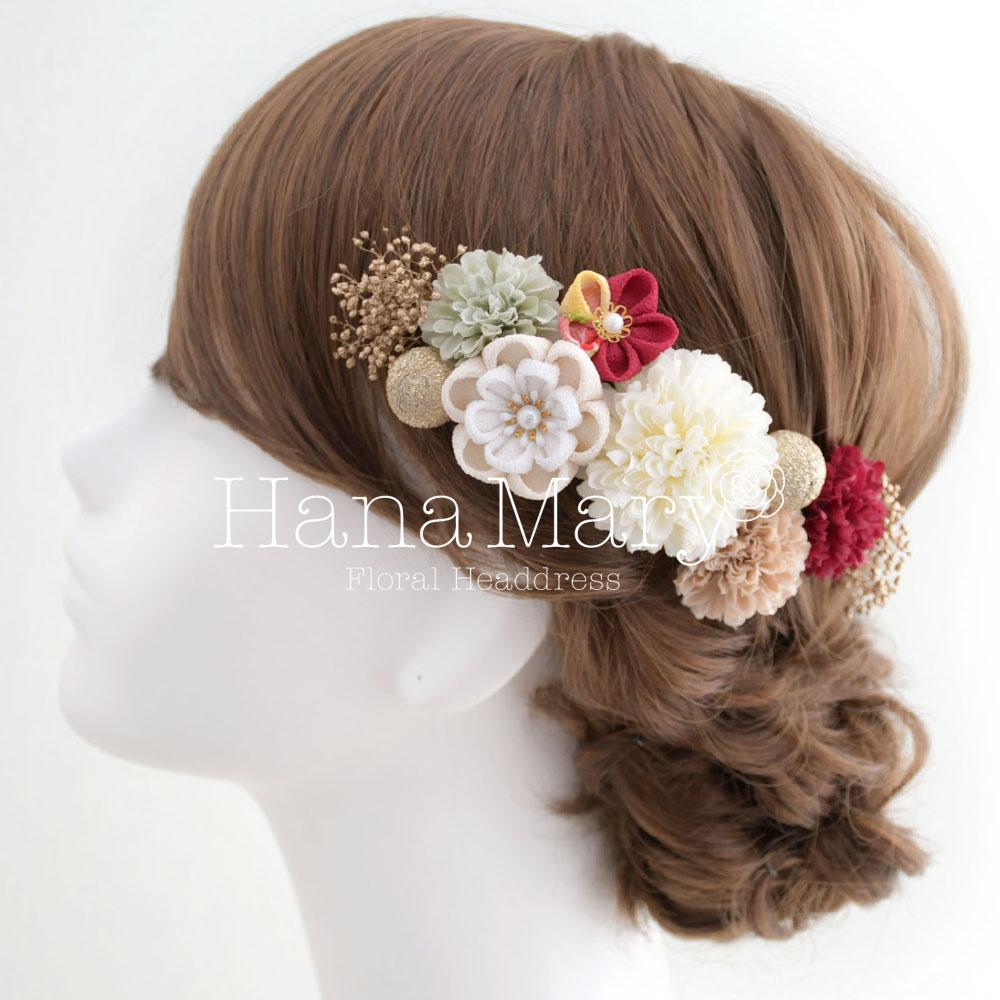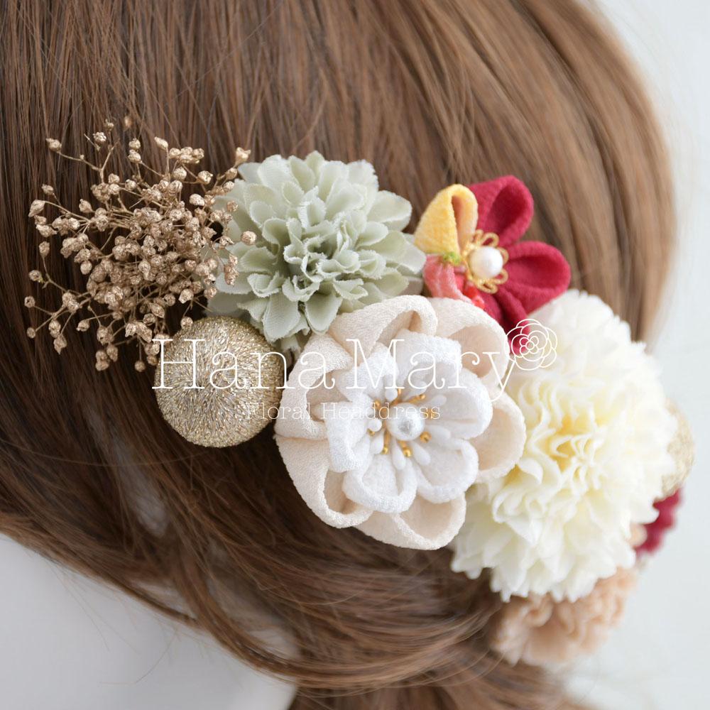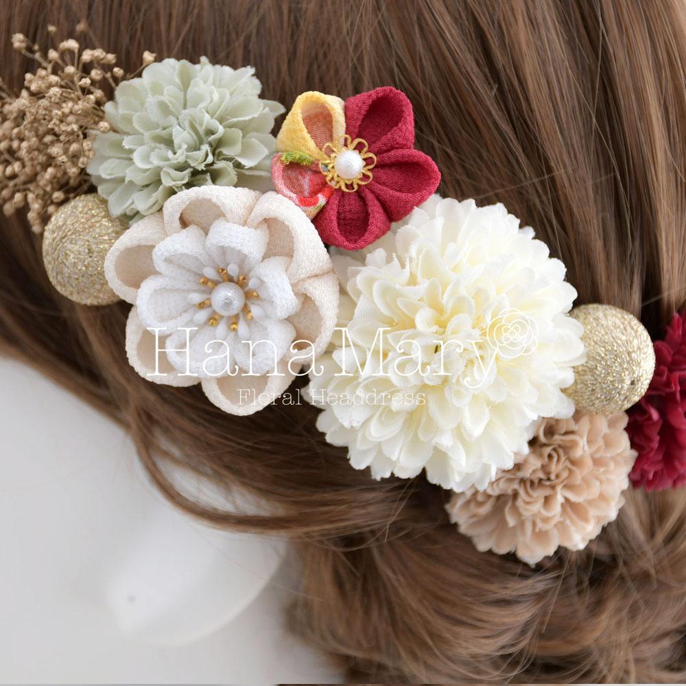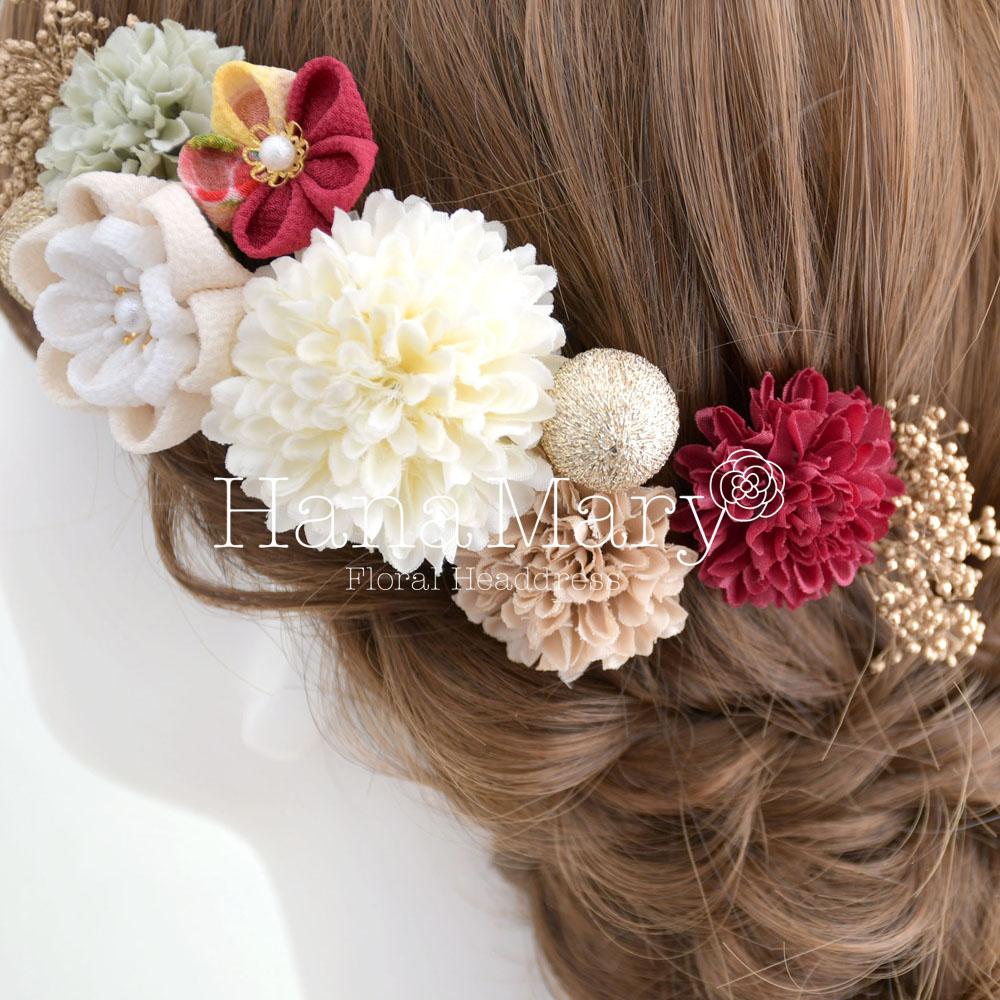 可愛らしいアートフラワーのマムに、かすみ草、鞠玉、丸花や牡丹のつまみ細工をヘアに沿わせるよう配置した髪飾り。