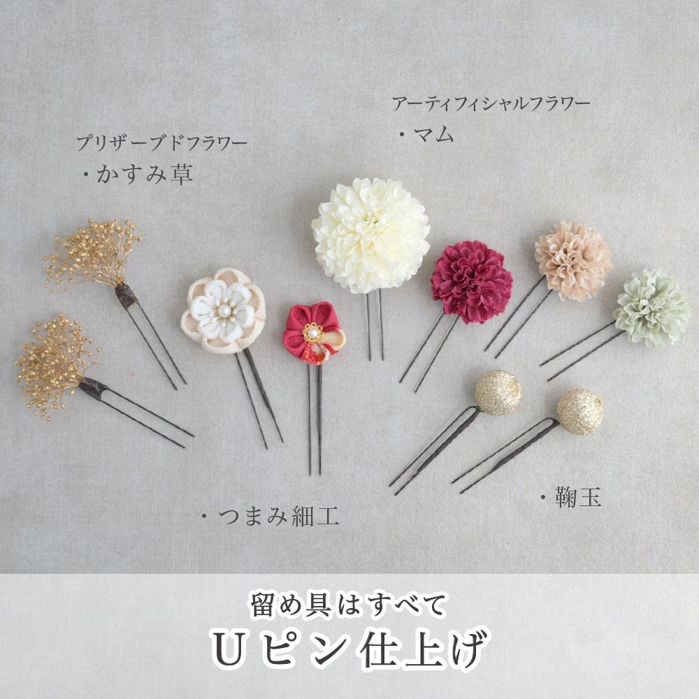 その日のヘアスタイルによって自由に一輪一輪配置できます。お花の数が多い場合でも、アメピンを追加して簡単にしっかりと固定できます。