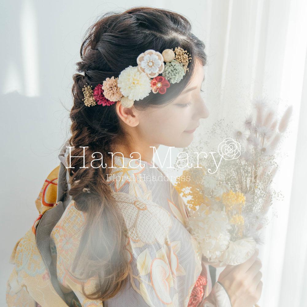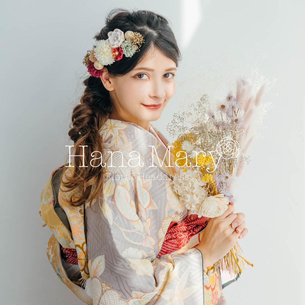 HanaMaryの髪飾りは生花をリアルに再現したアートフラワーと呼ばれるハイクオリティーな造花を使用しています。耐久性に優れ、成人式・卒業式やウェディングなどに何度でも繰り返し使用することができます。