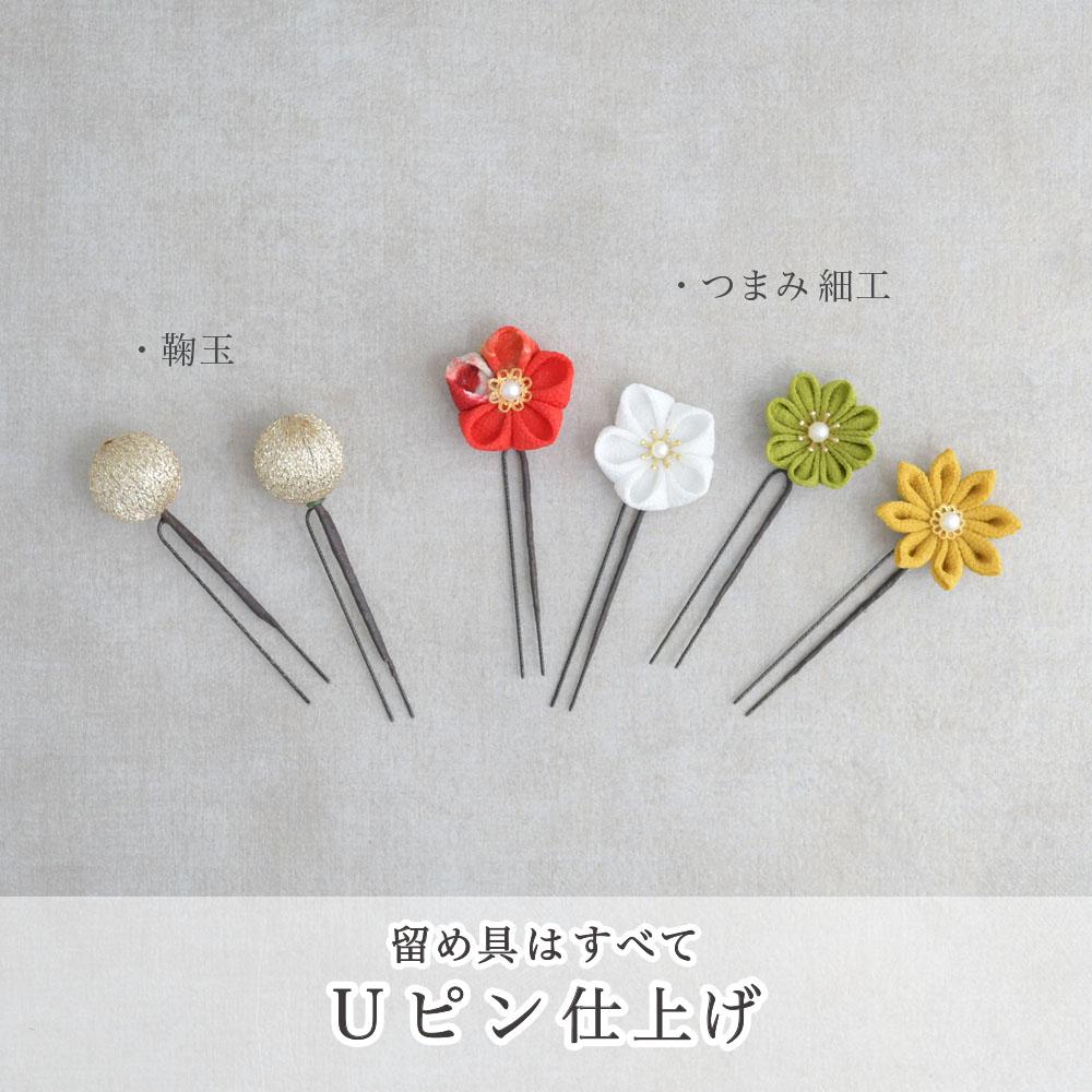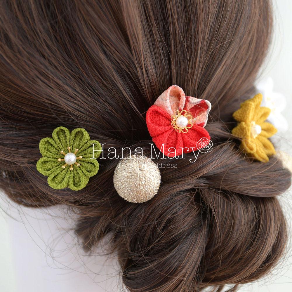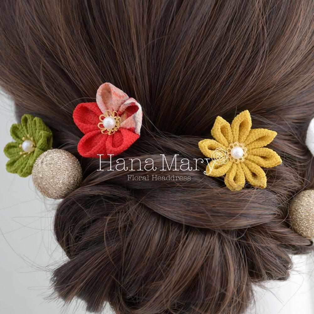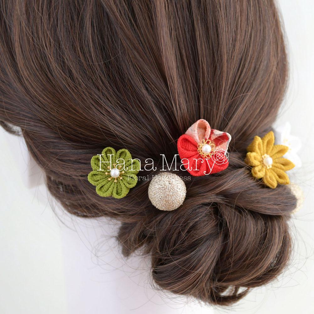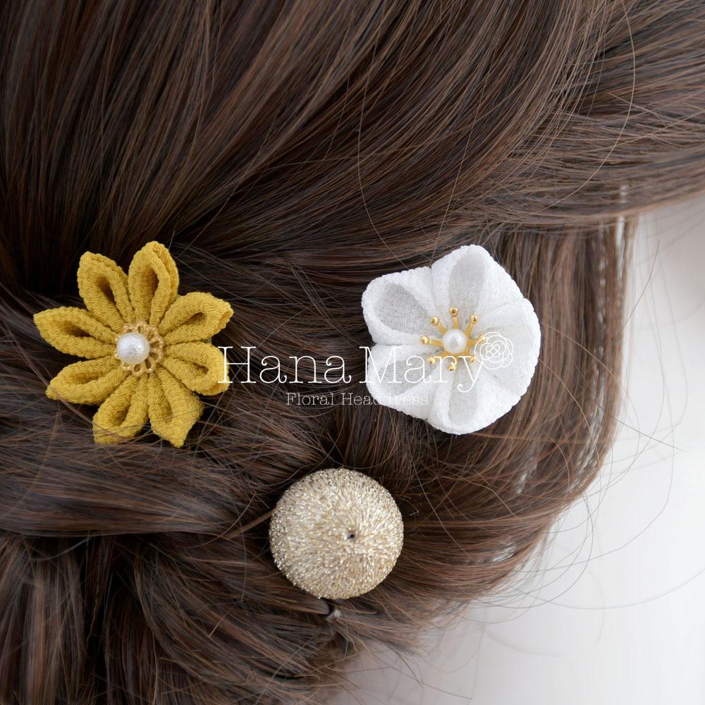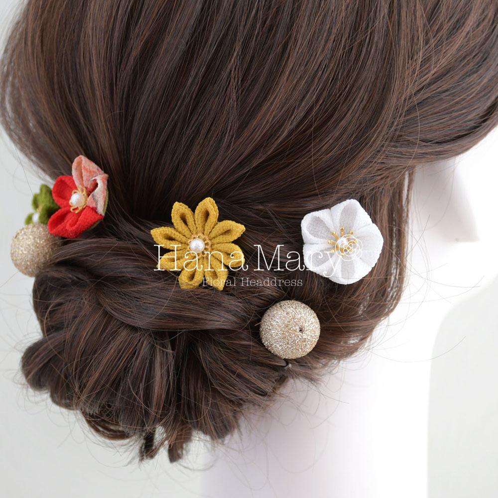 モダンな印象に仕上がるゴールドの鞠玉とつまみ細工の小花をヘアスタイルに合わせて散りばめます。