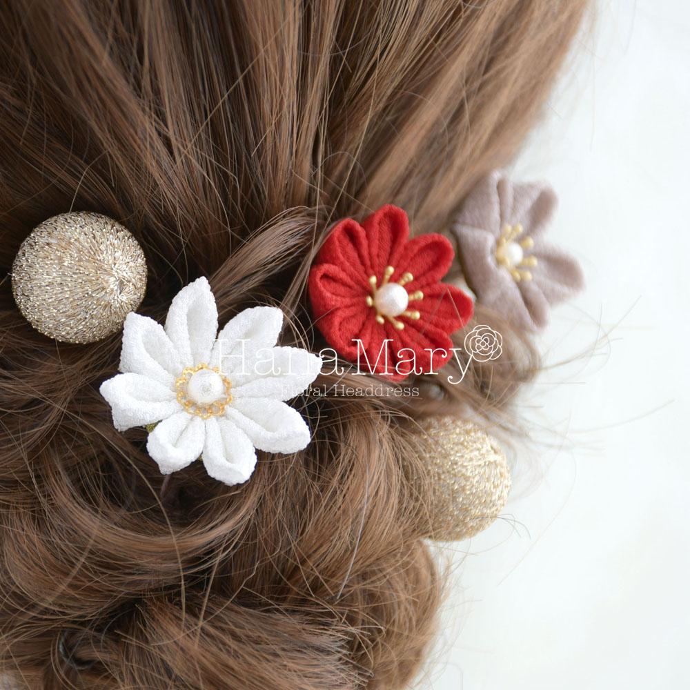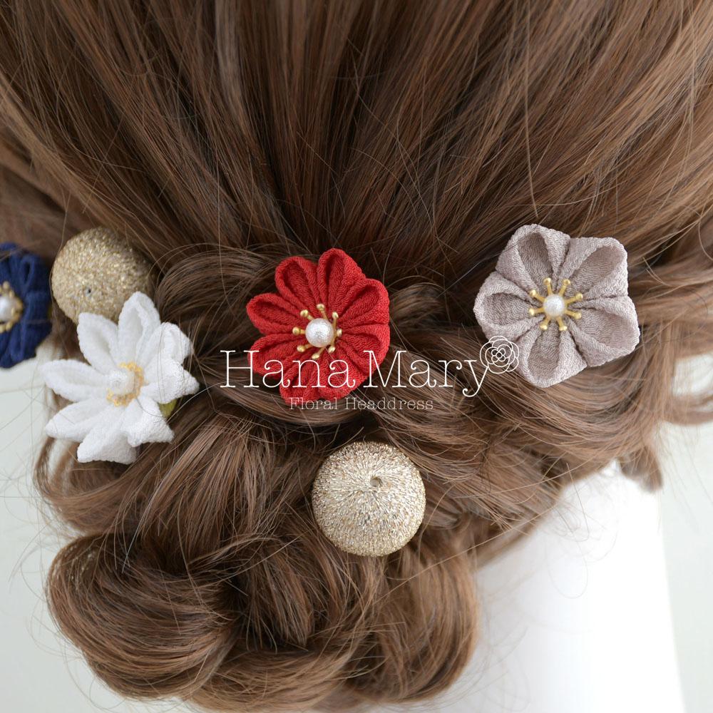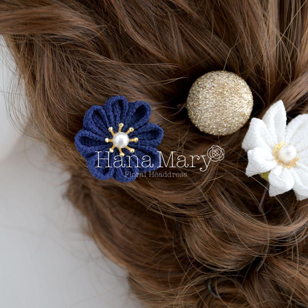 モダンな印象に仕上がるゴールドの鞠玉とつまみ細工の小花をヘアスタイルに合わせて散りばめます。