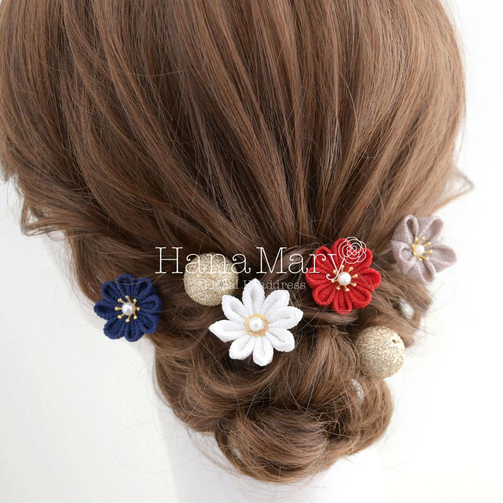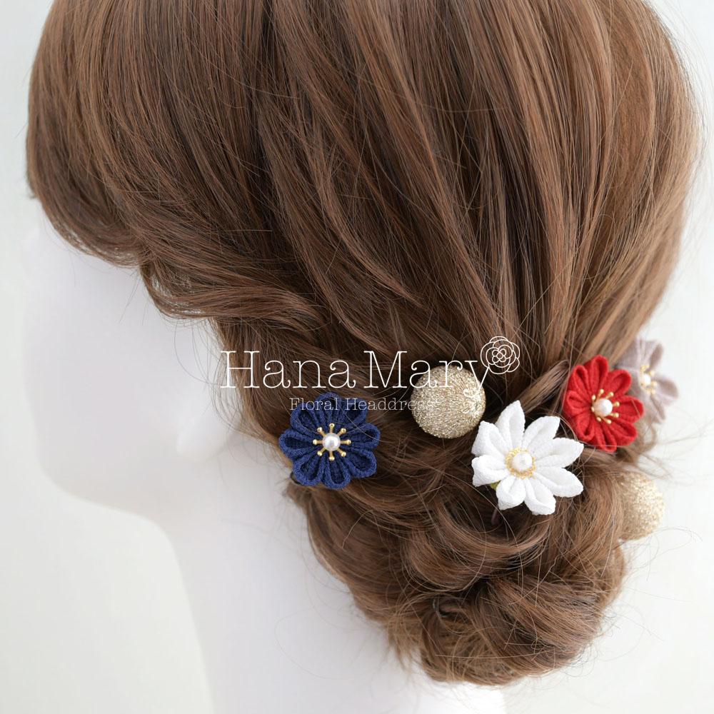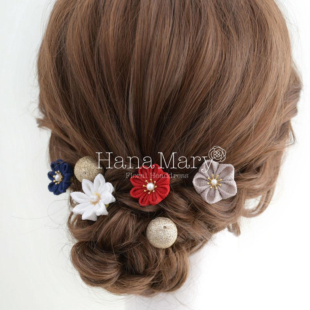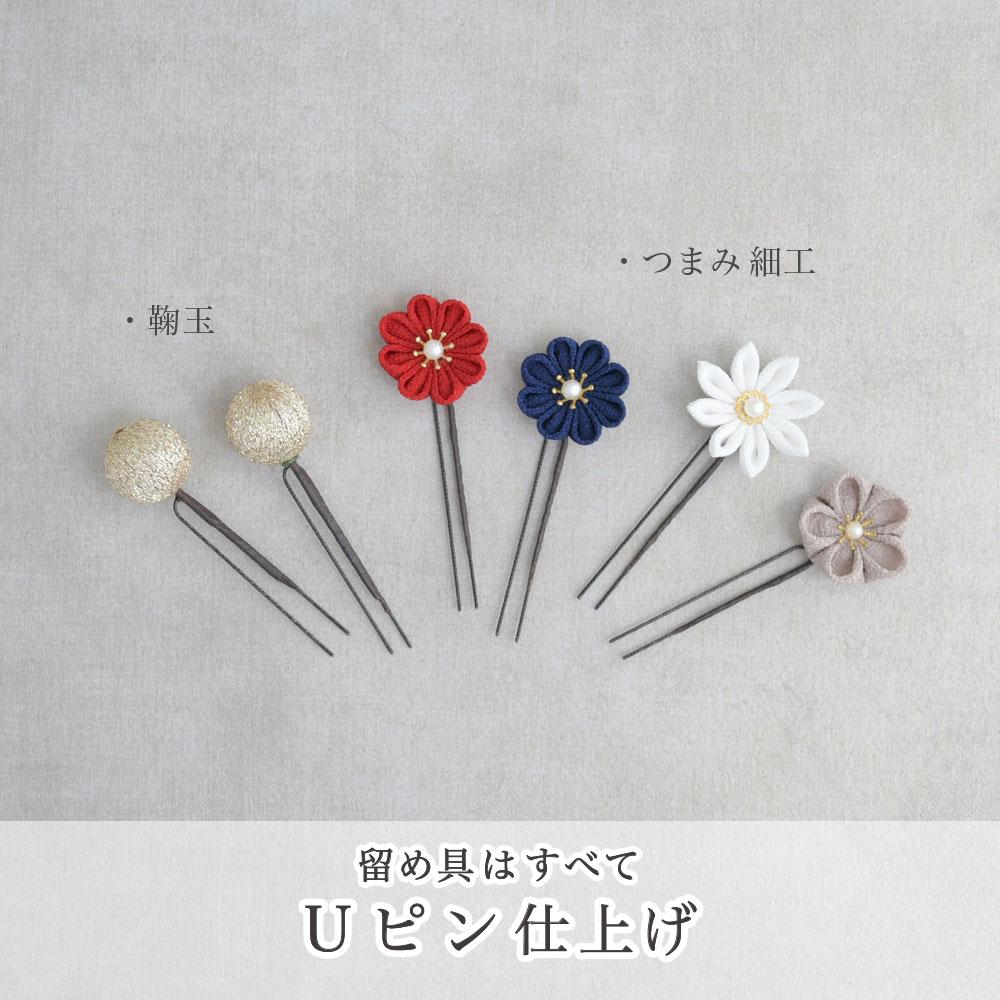 モダンな印象に仕上がるゴールドの鞠玉とつまみ細工の小花をヘアスタイルに合わせて散りばめます。