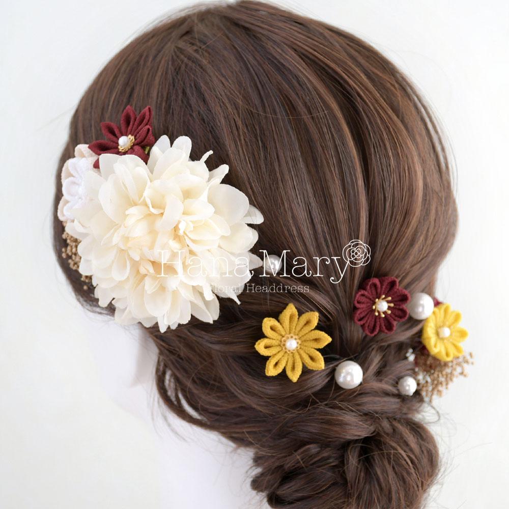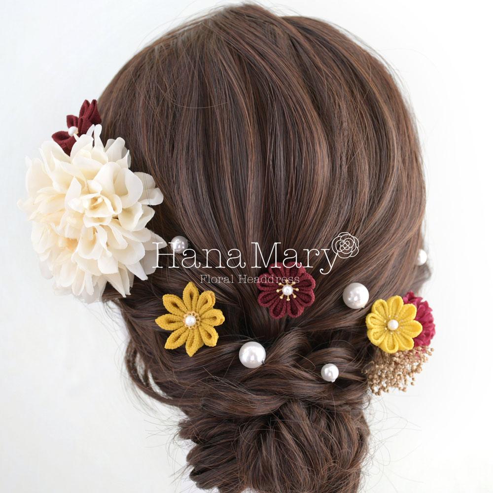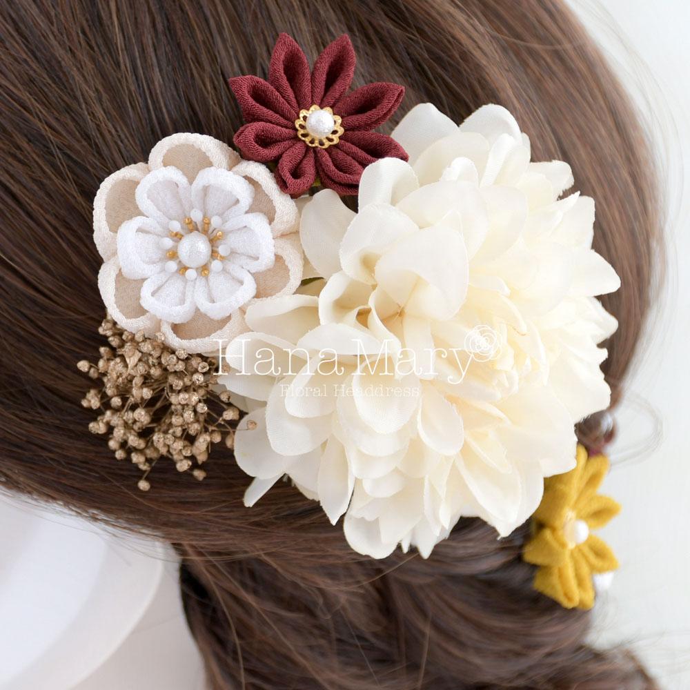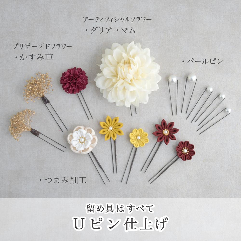 HanaMaryの髪飾りは生花をリアルに再現したアートフラワーと呼ばれるハイクオリティーな造花を使用しています。耐久性に優れ、成人式・卒業式やウェディングなどに何度でも繰り返し使用することができます。