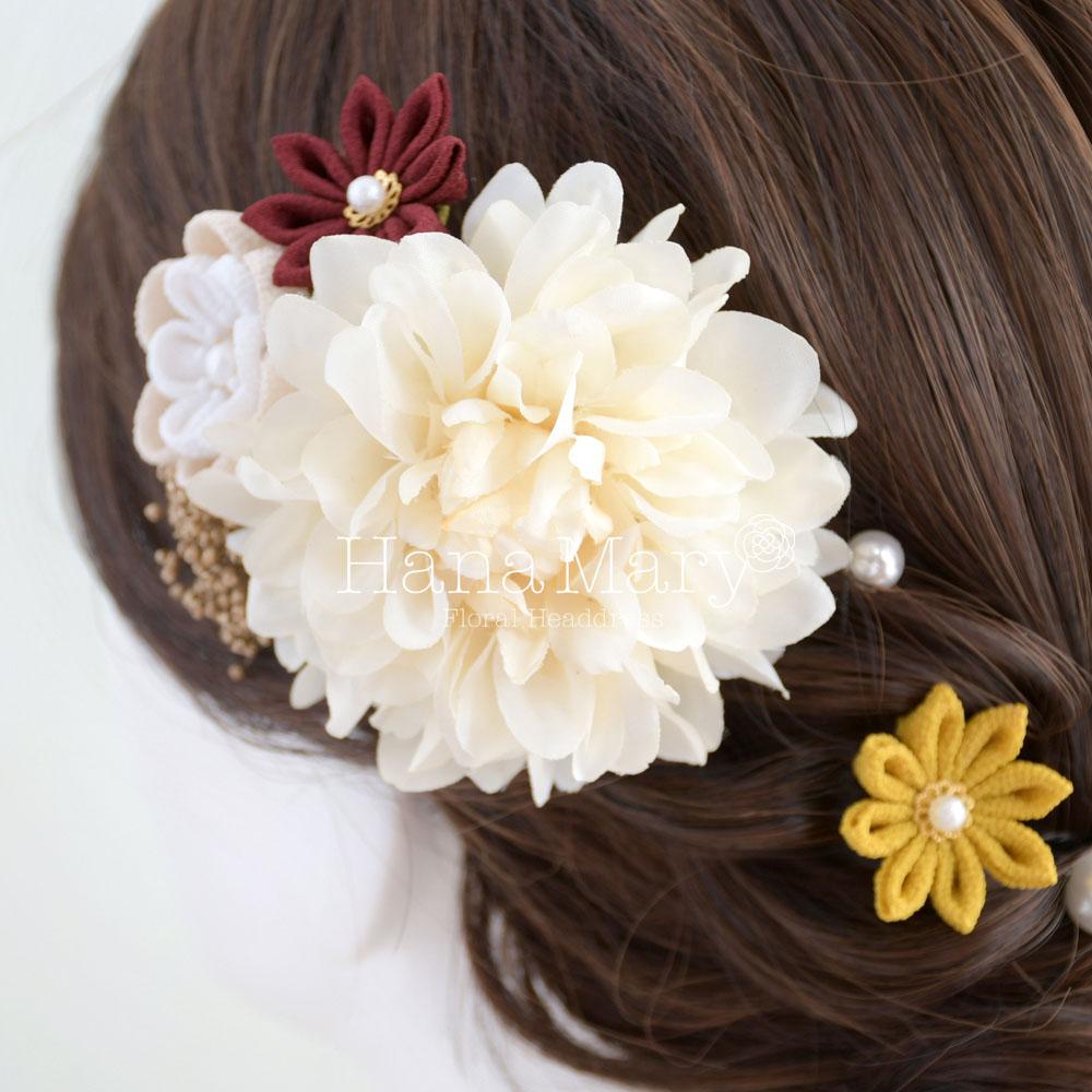 生花と見間違うほどにリアルなアーティフィシャルフラワーのダリアをメインに色とりどりのつまみ細工を散りばめた髪飾り。