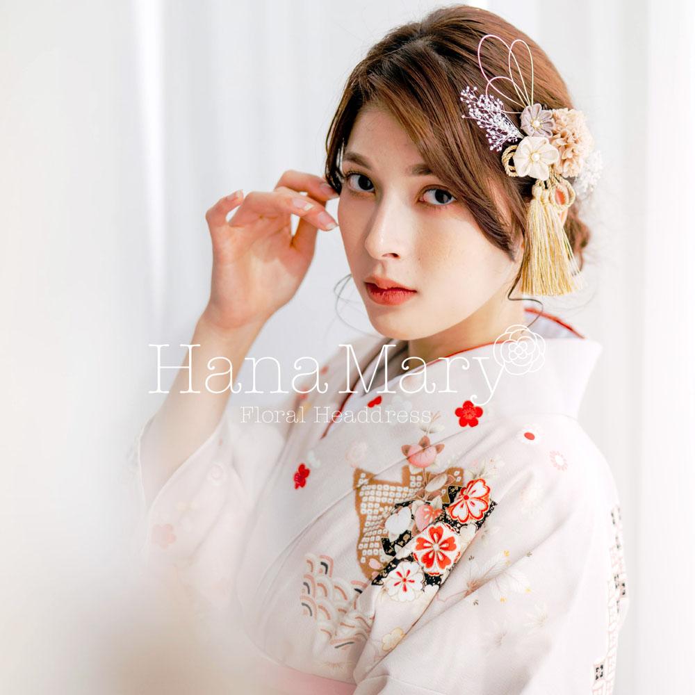 HanaMaryの髪飾りは生花をリアルに再現したアートフラワーと呼ばれるハイクオリティーな造花を使用しています。耐久性に優れ、成人式・卒業式やウェディングなどに何度でも繰り返し使用することができます。