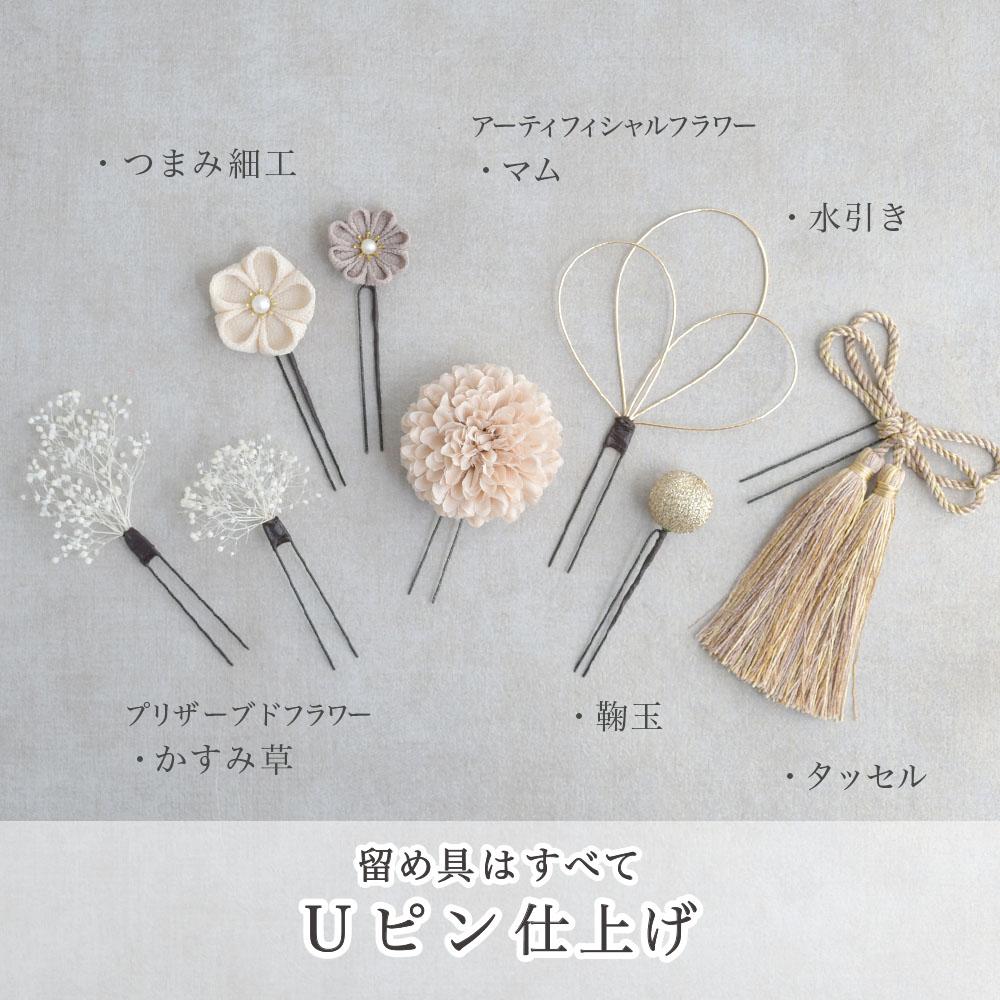 その日のヘアスタイルによって自由に一輪一輪配置できます。お花の数が多い場合でも、アメピンを追加して簡単にしっかりと固定できます。