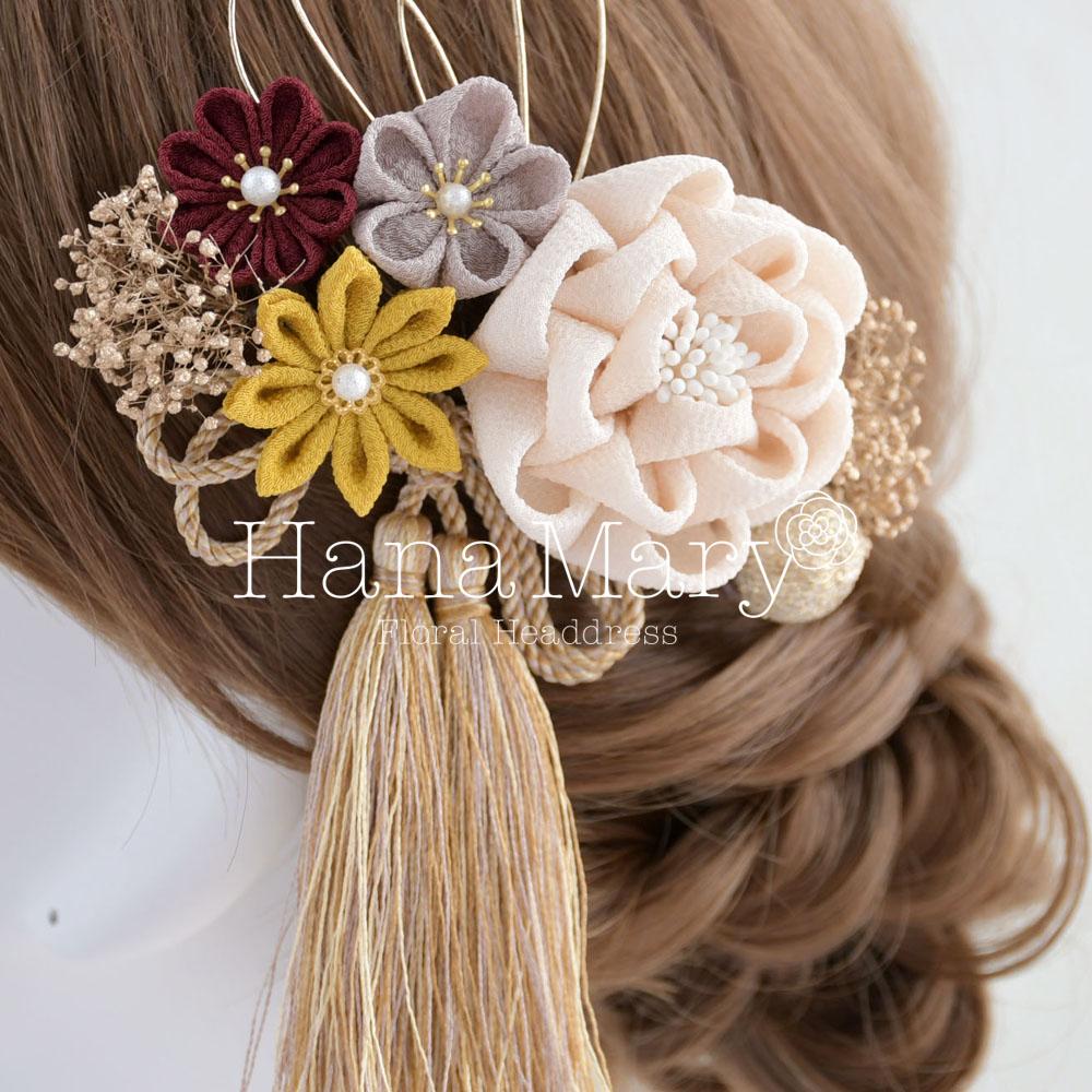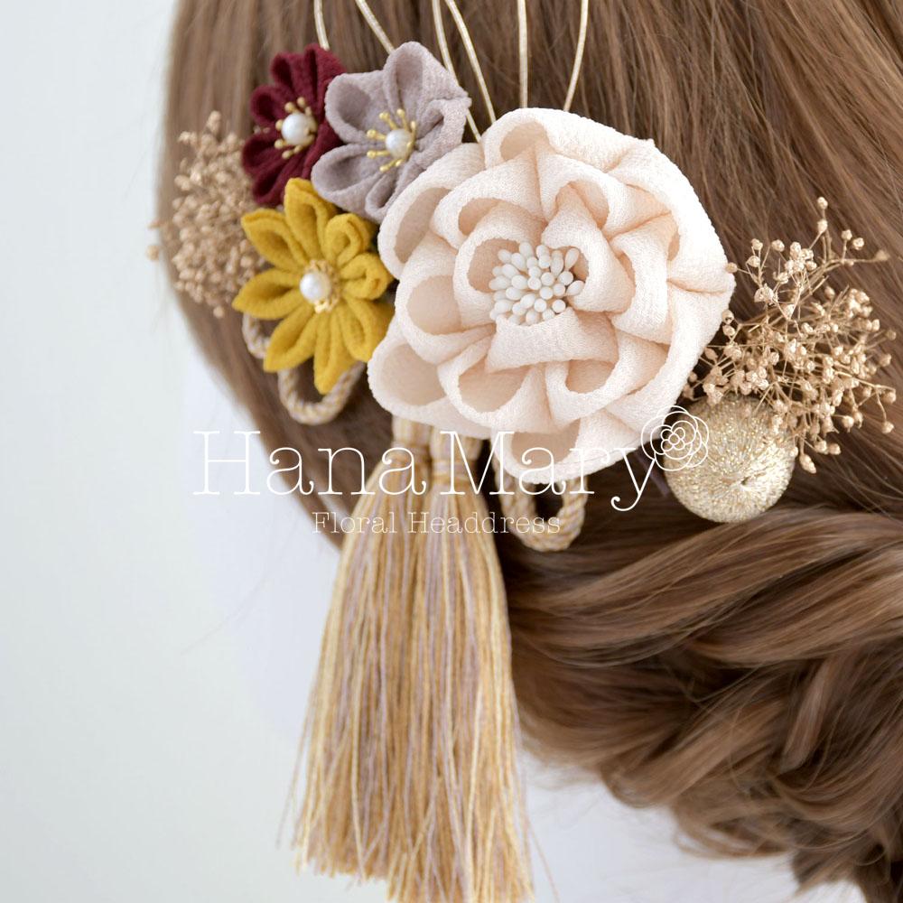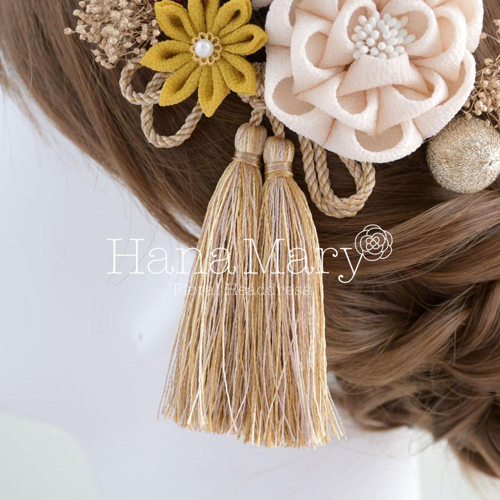 HanaMaryの髪飾りは生花をリアルに再現したアートフラワーと呼ばれるハイクオリティーな造花を使用しています。耐久性に優れ、成人式・卒業式やウェディングなどに何度でも繰り返し使用することができます。