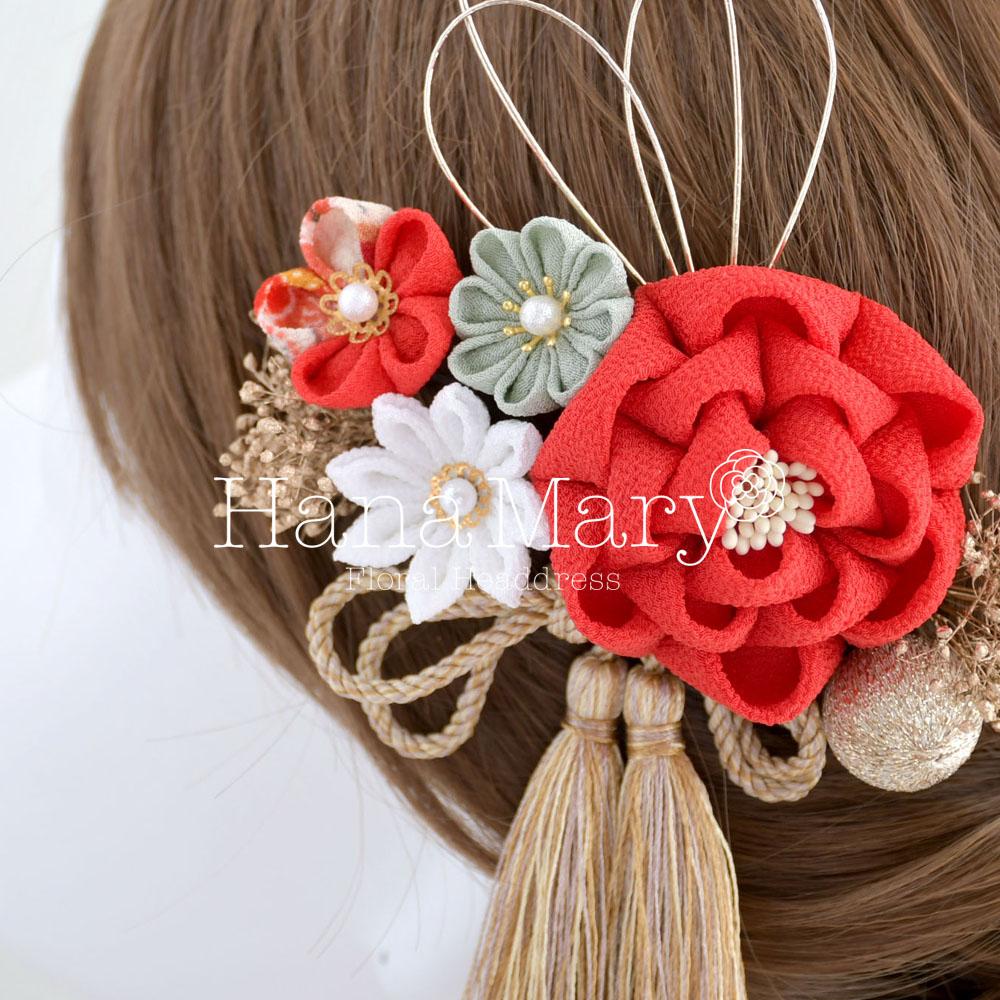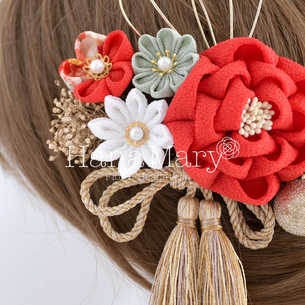 椿のお花を模したつまみ細工をメインに、使いやすい和モダンカラーのつまみ細工を組み合わせた逸品。