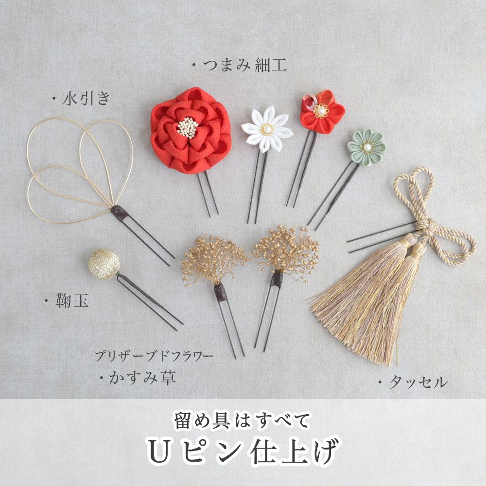 その日のヘアスタイルによって自由に一輪一輪配置できます。お花の数が多い場合でも、アメピンを追加して簡単にしっかりと固定できます。